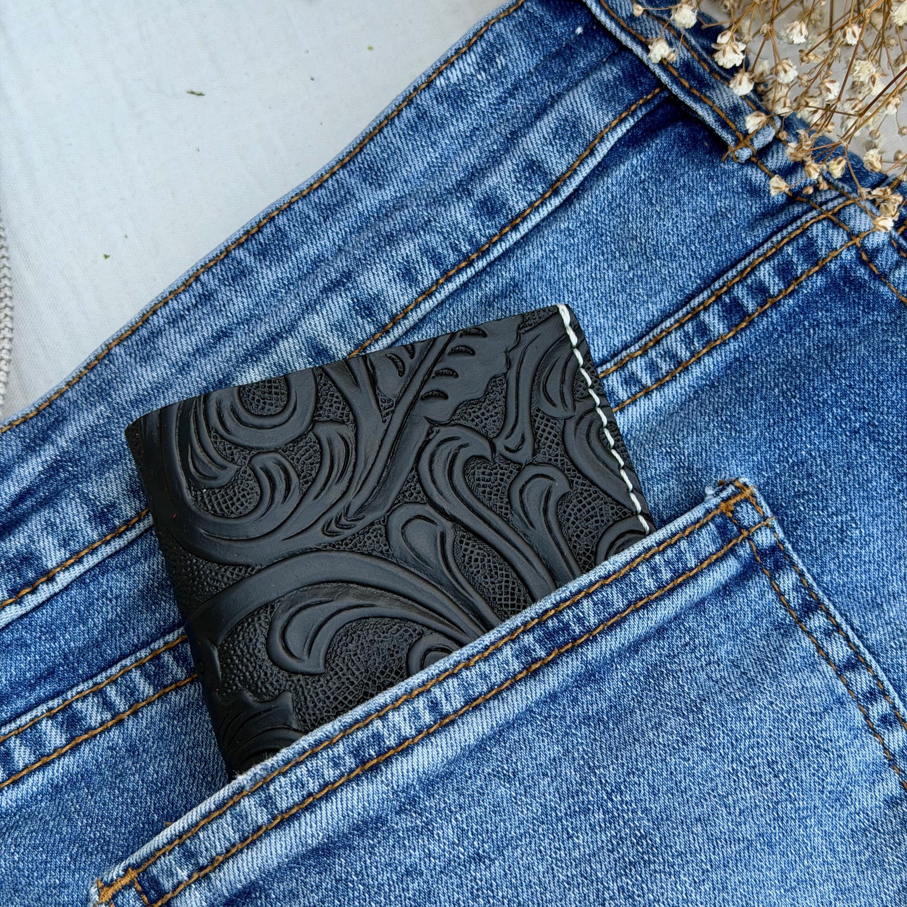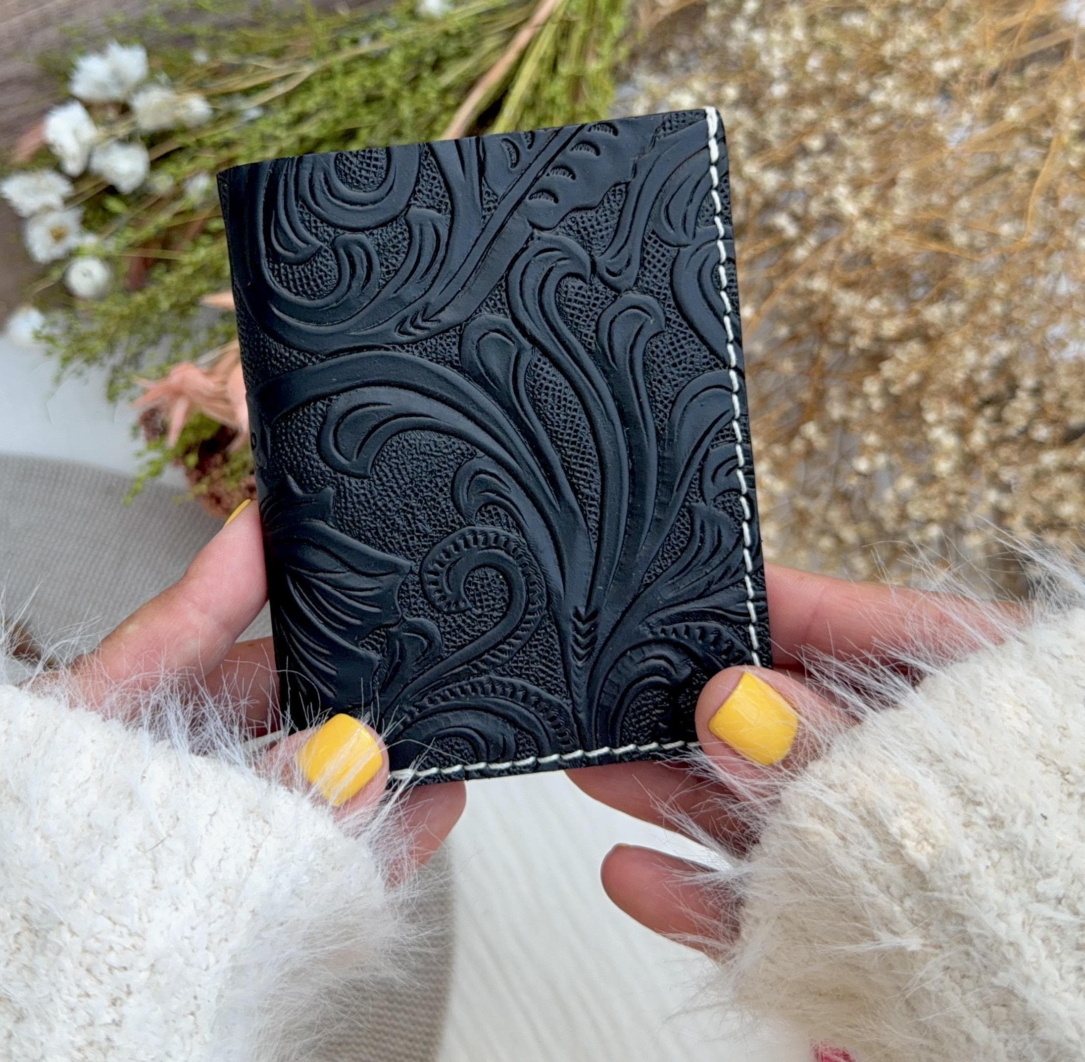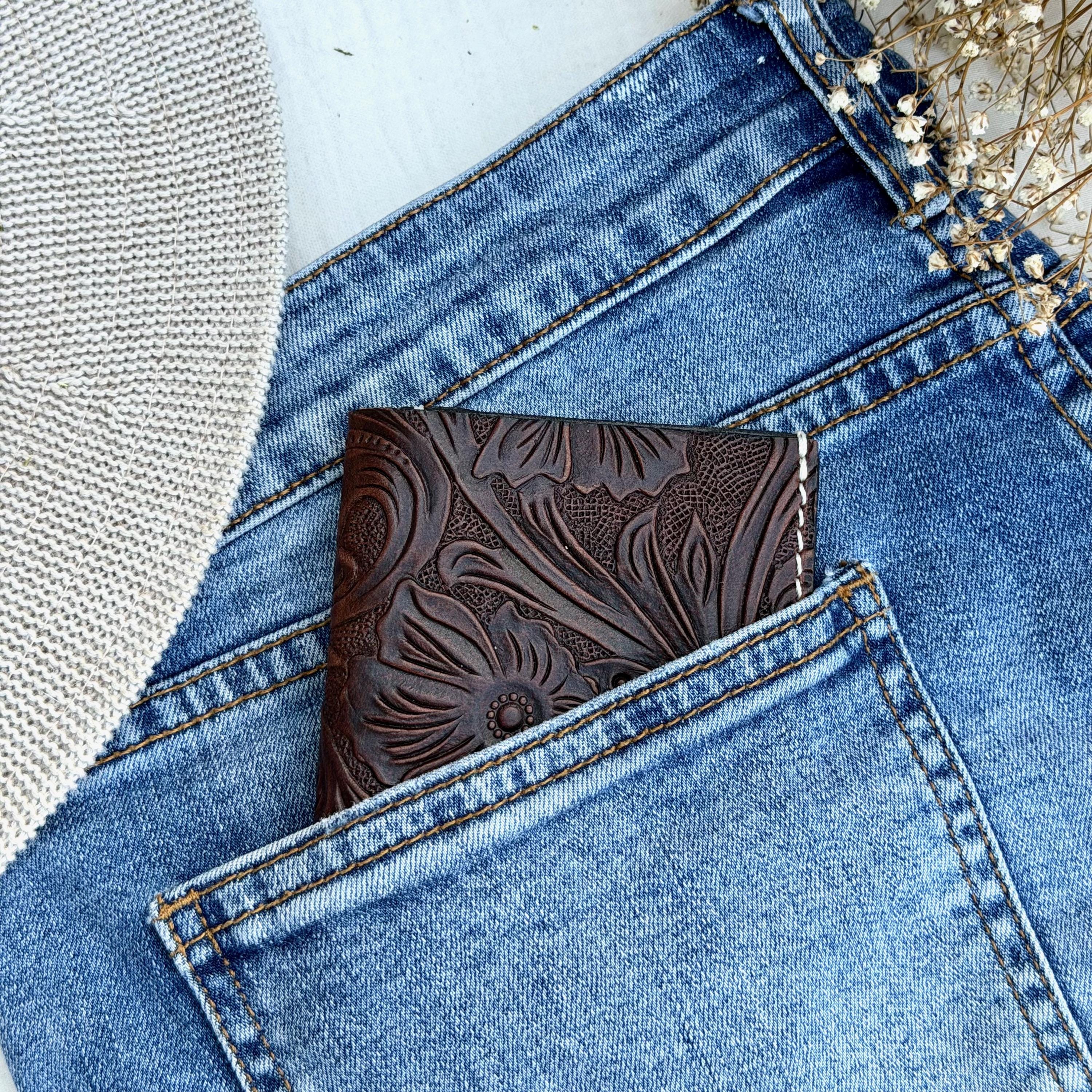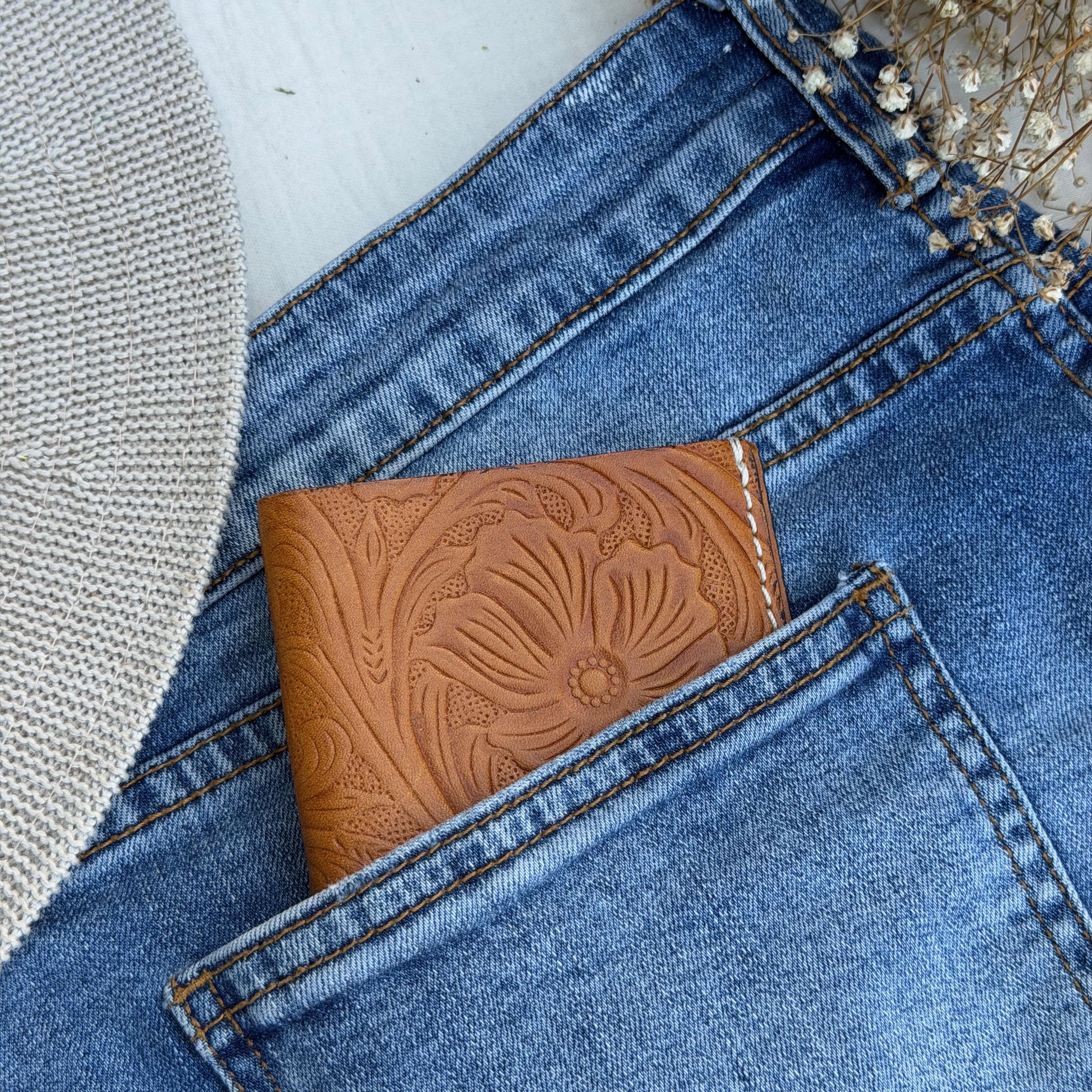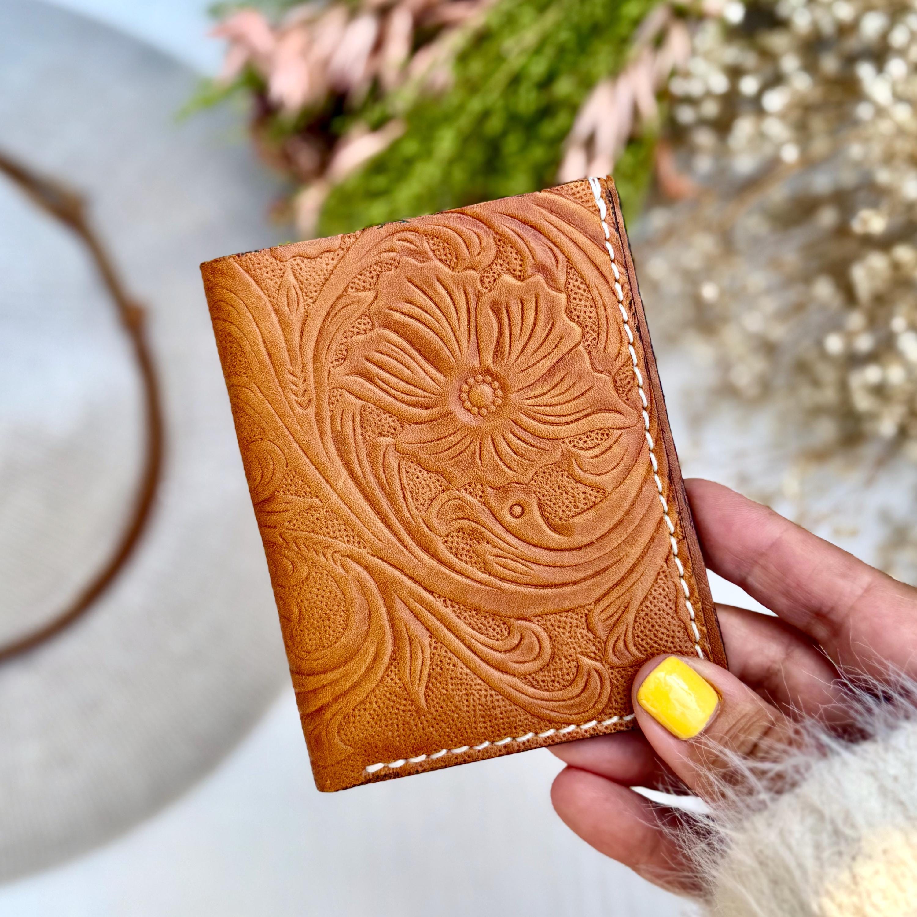 Tooled Leather Card Holder for Women - Floral Wallet - Small Western Bifold Wallet