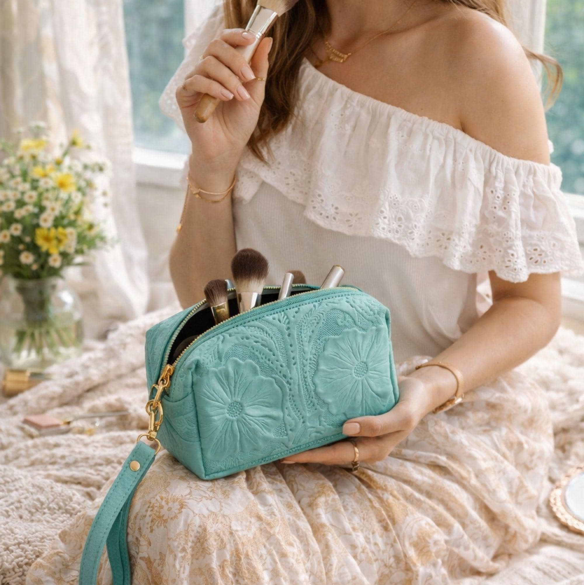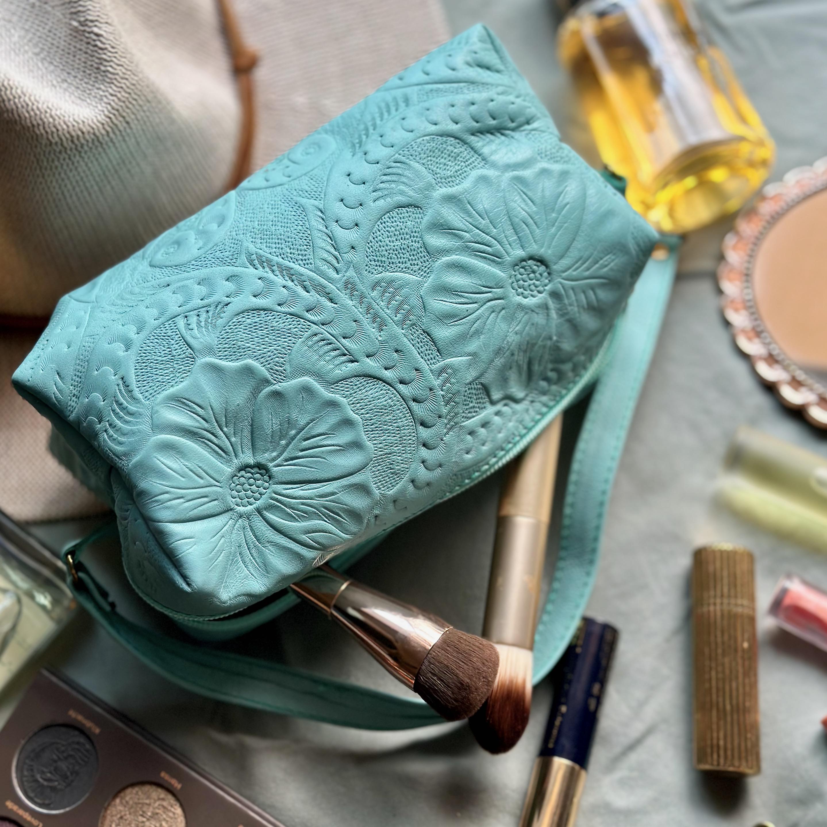 Keep your beauty essentials organized in style with our handcrafted leather makeup bag. Featuring an embossed floral design, soft fabric lining, and optional monogram personalization, this makeup pouch is both beautiful and practical.