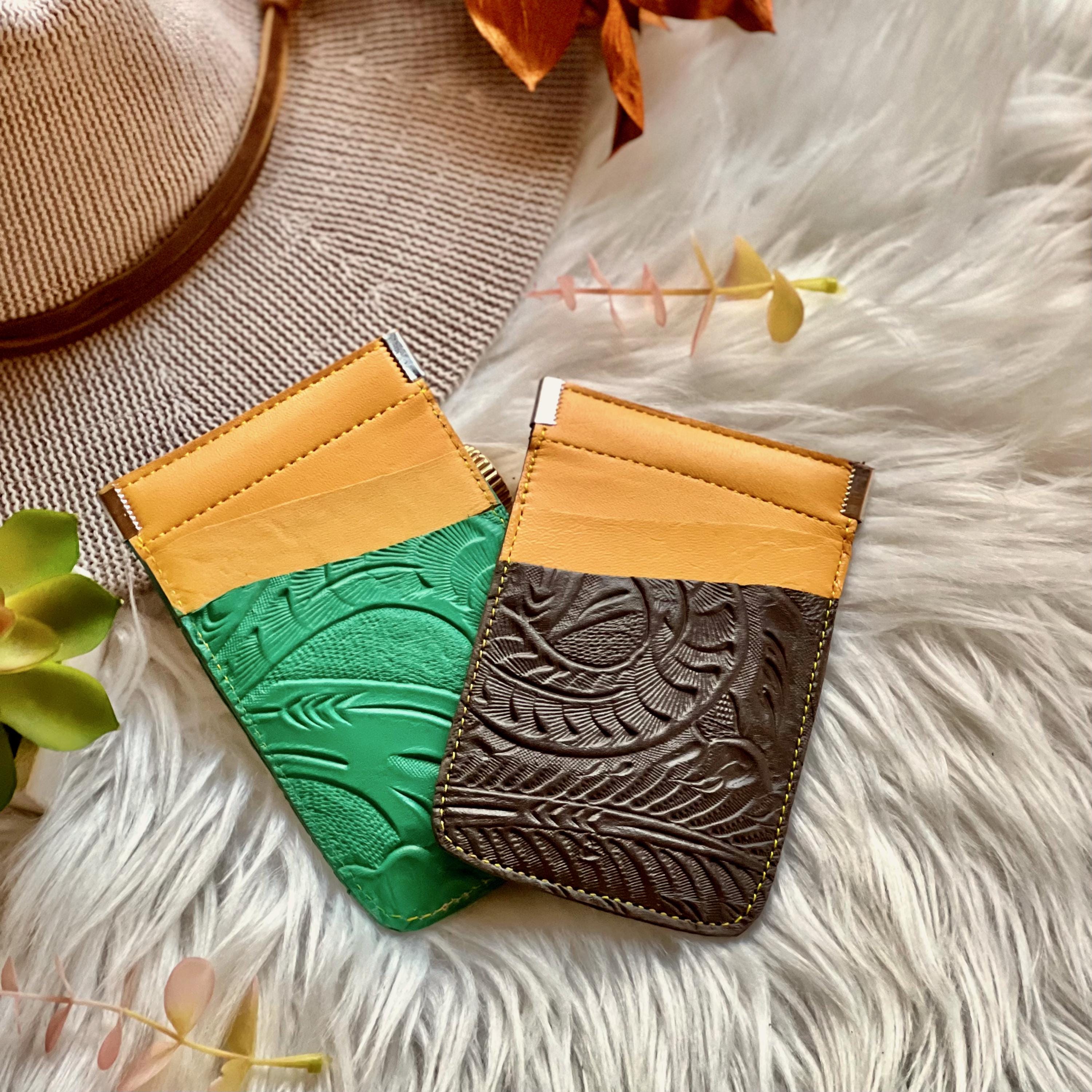 Handcrafted from genuine leather and detailed with carved flowers, this slim card holder blends artistry with everyday function. Perfect for carrying your essentials in style - a thoughtful leather gift for her, ideal for Christmas, Hanukkah, or anniversaries.