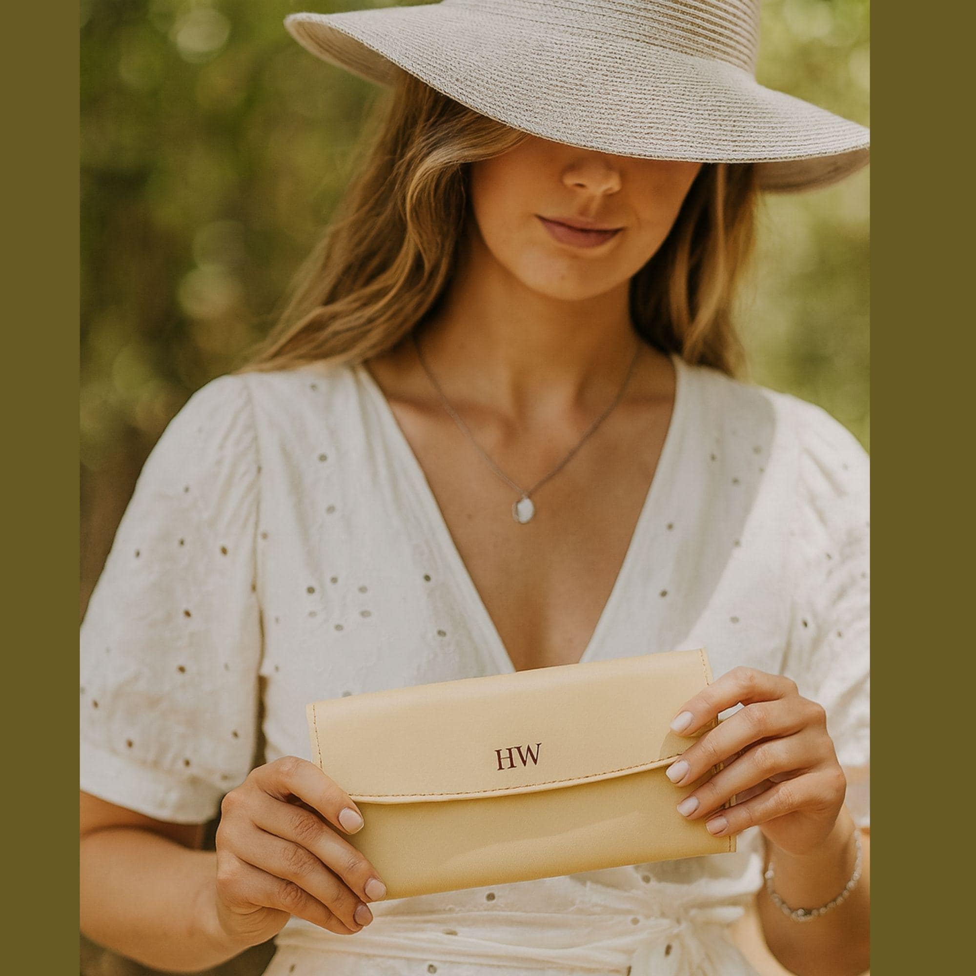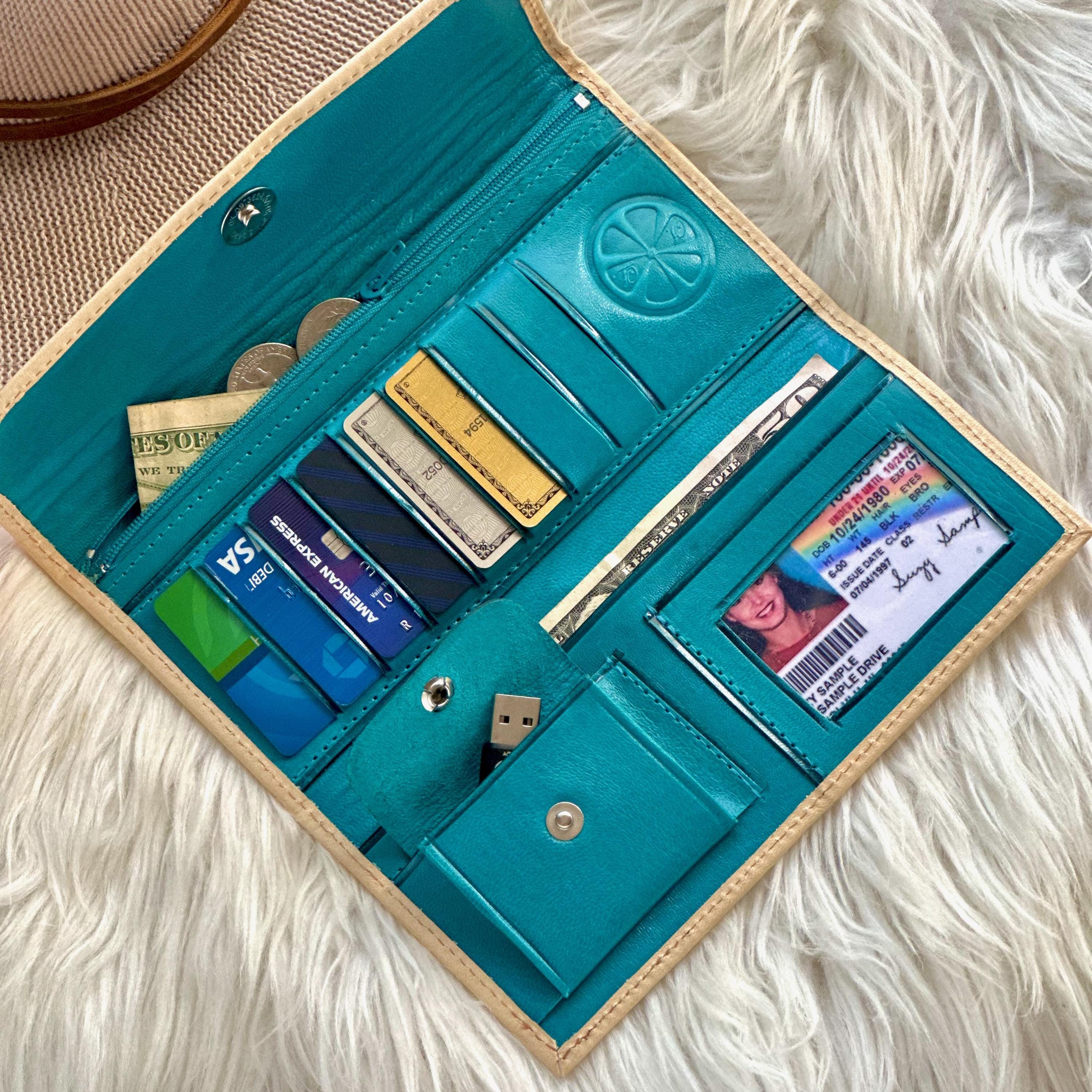 Available in vibrant colors like sunny yellow with a teal interior and refreshing mint with a chocolate interior, our wallets are sure to make a statement wherever you go. But it's not just about looks – our wallets are also highly functional, with multiple card slots, compartments, and a sleek design that fits perfectly in your handbag or pocket.