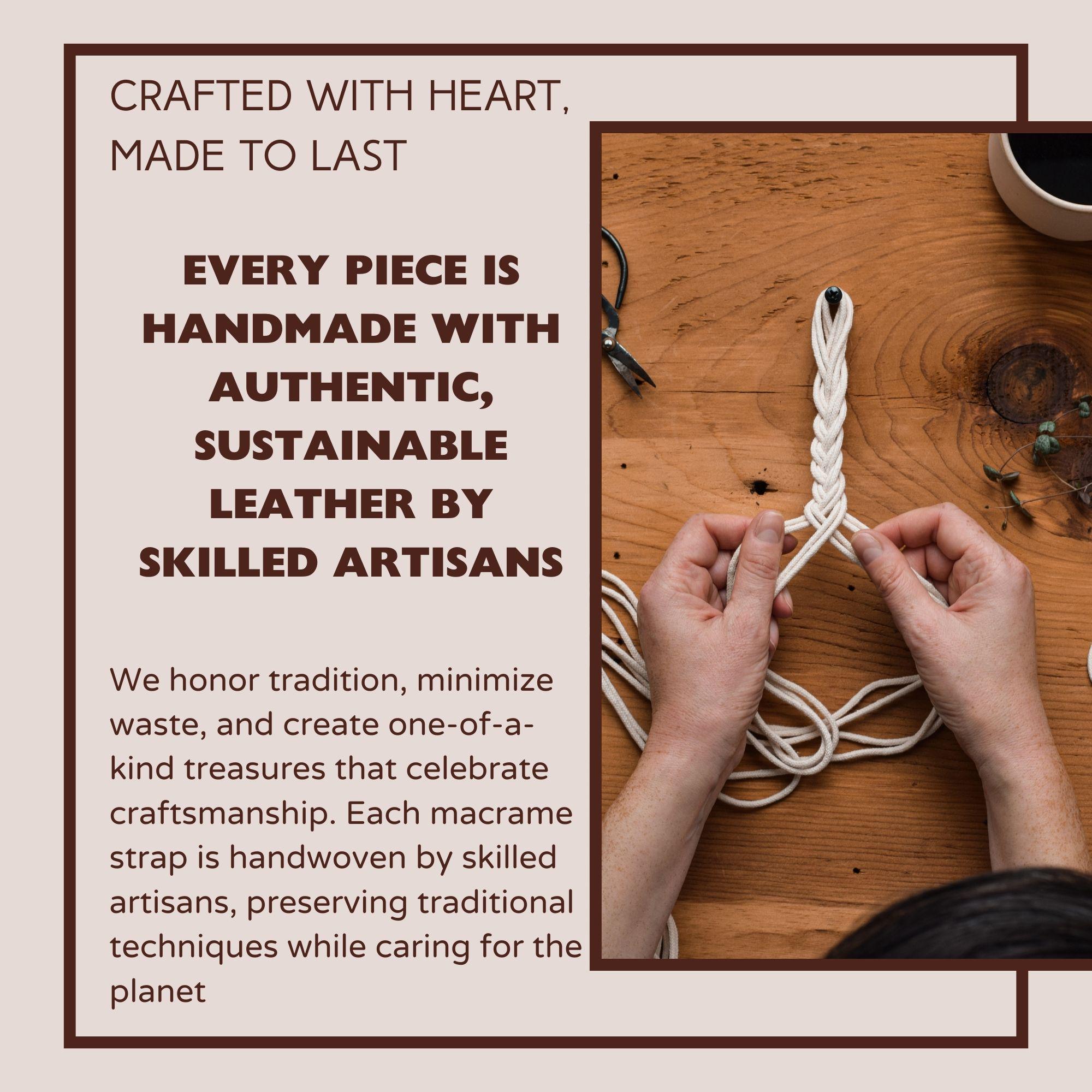 The handwoven macrame strap is crafted by skilled elderly artisans, preserving traditional weaving techniques passed down through generations. Every piece is unique, handmade, and thoughtfully designed.