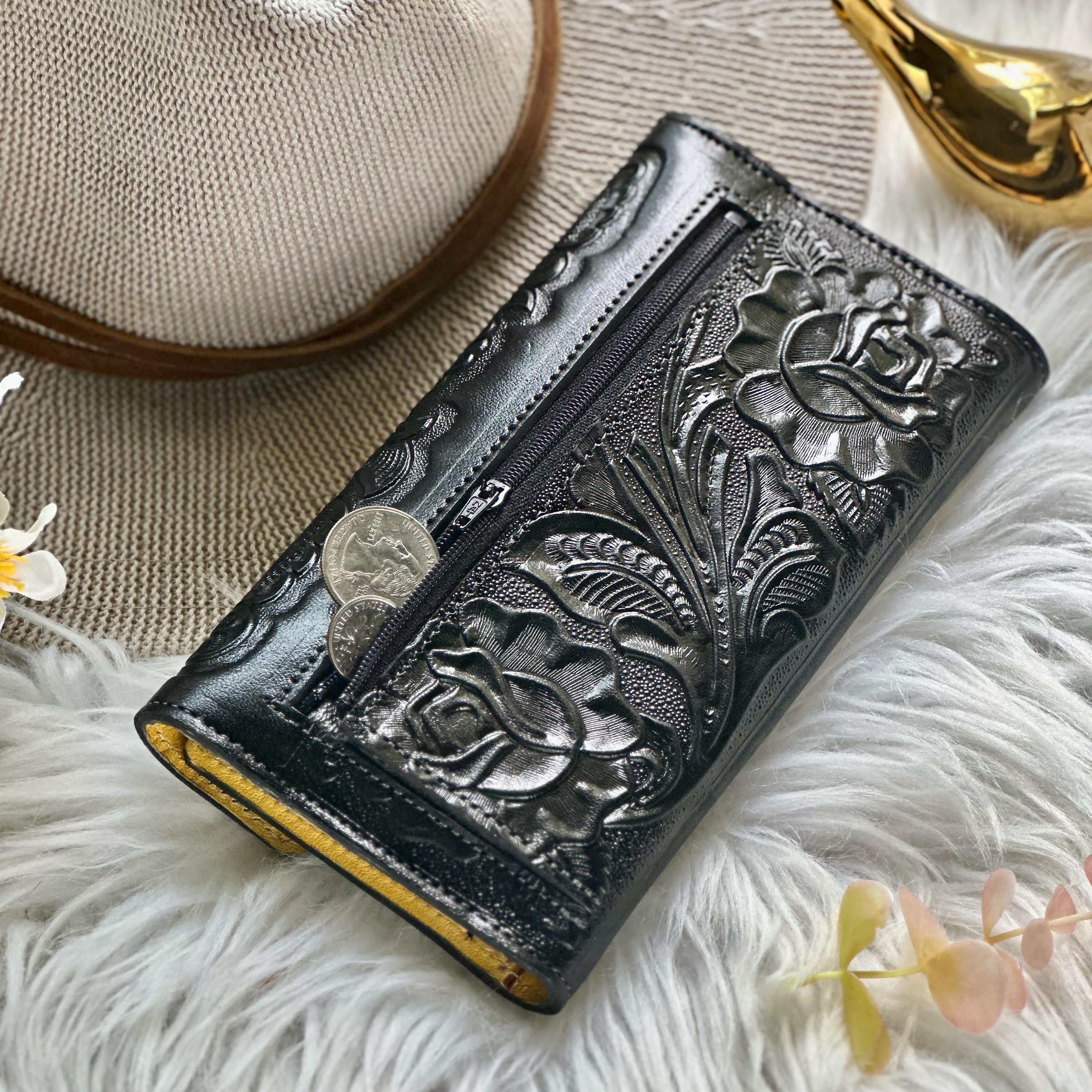 Each wallet is made one at a time from sustainable leather and embossed with bold floral designs a boho-style favorite that's both functional and full of character.