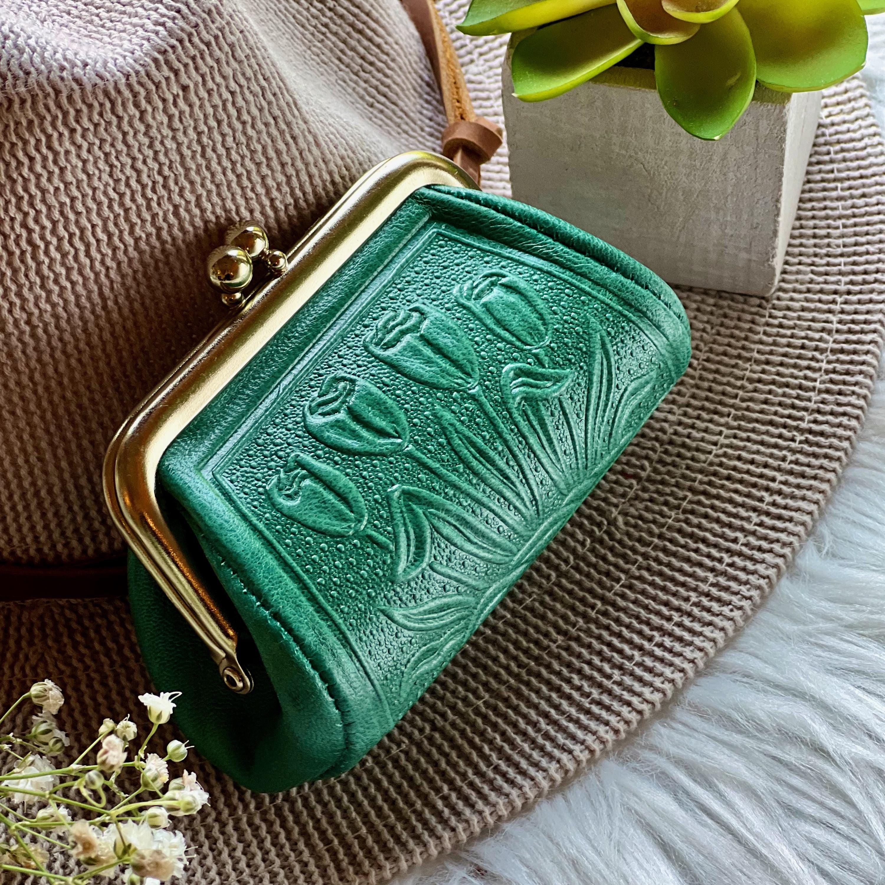 Beautiful quality coin purse. The rich green is prettier in person. The embossing is very detailed ( tulips). The closing mechanism works smoothly. It was packaged for gifting and shipped quickly. I highly recommend this shop! Thanks!