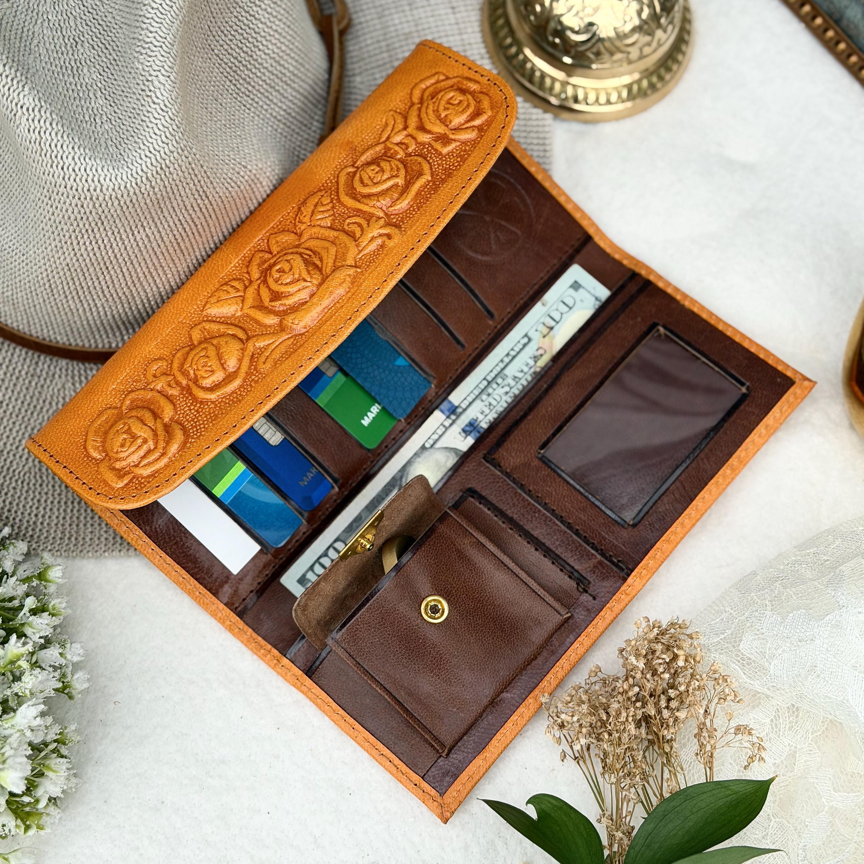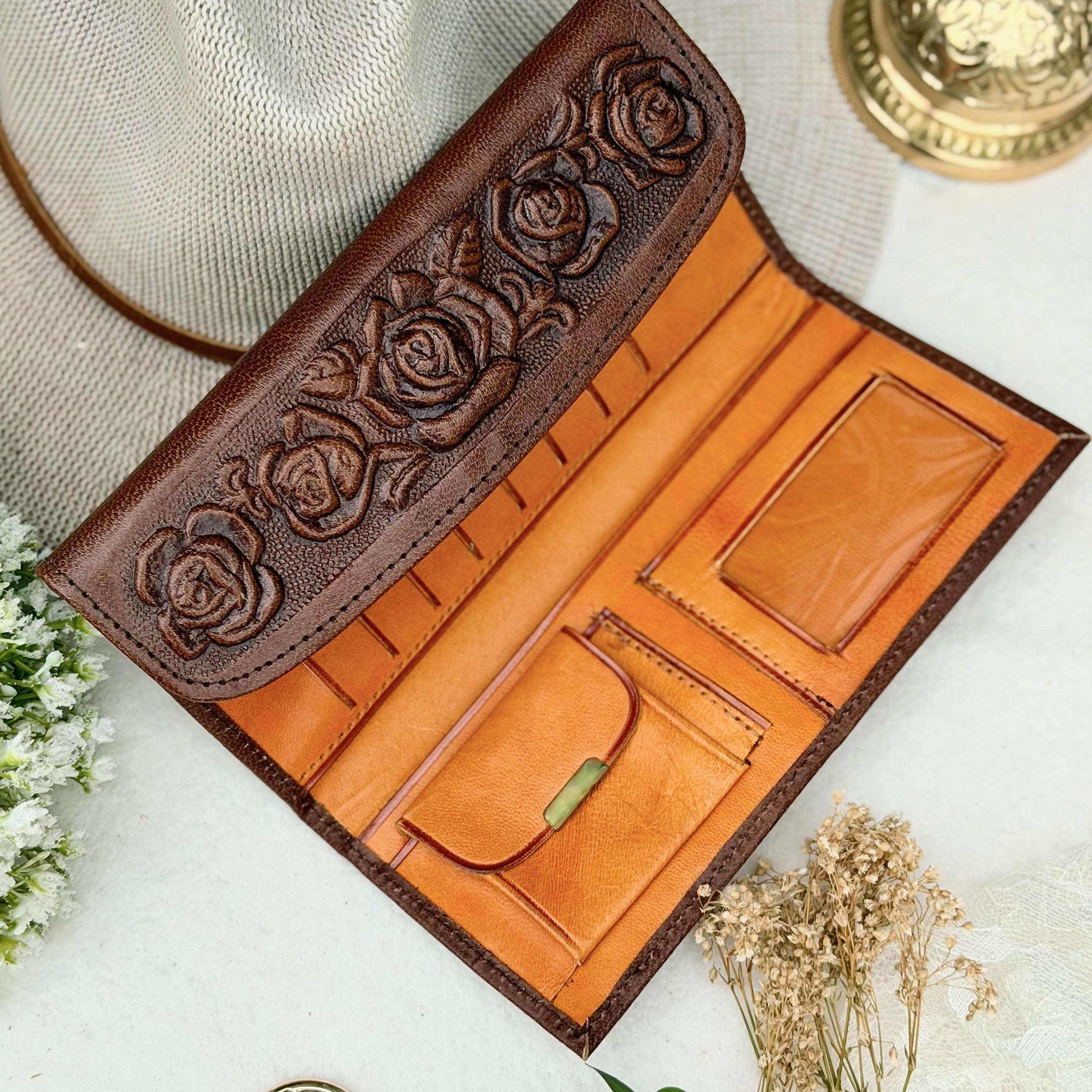 Rose embossed leather wallet for women, handmade from sustainable goat leather. This floral long wallet combines vintage boho style with everyday organization, making it a beautiful personalized gift she will use daily.