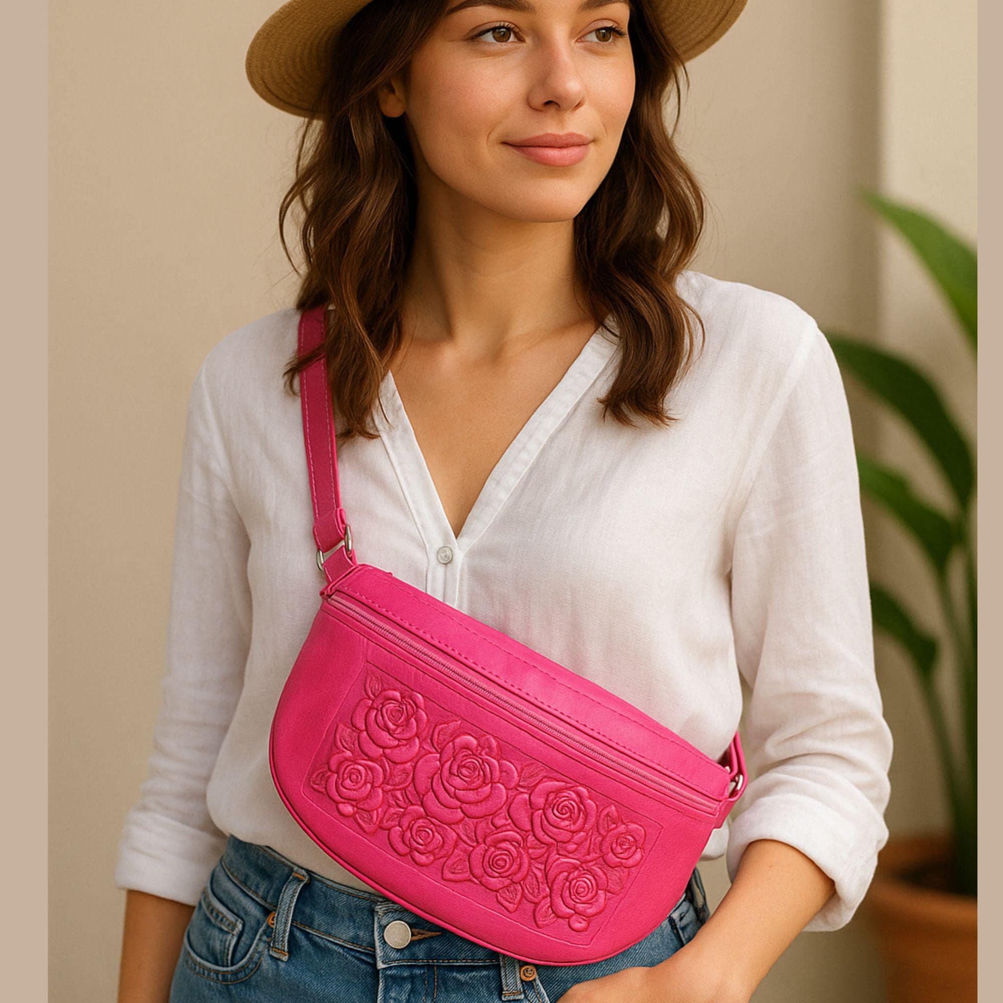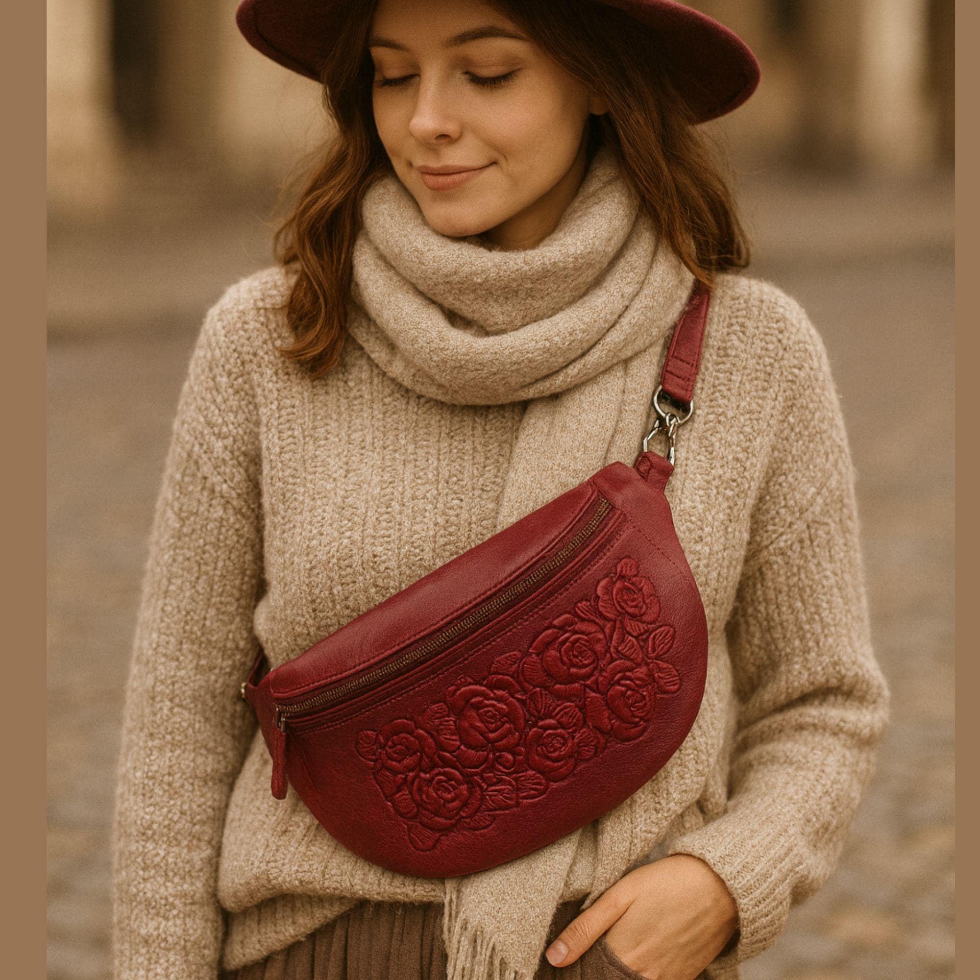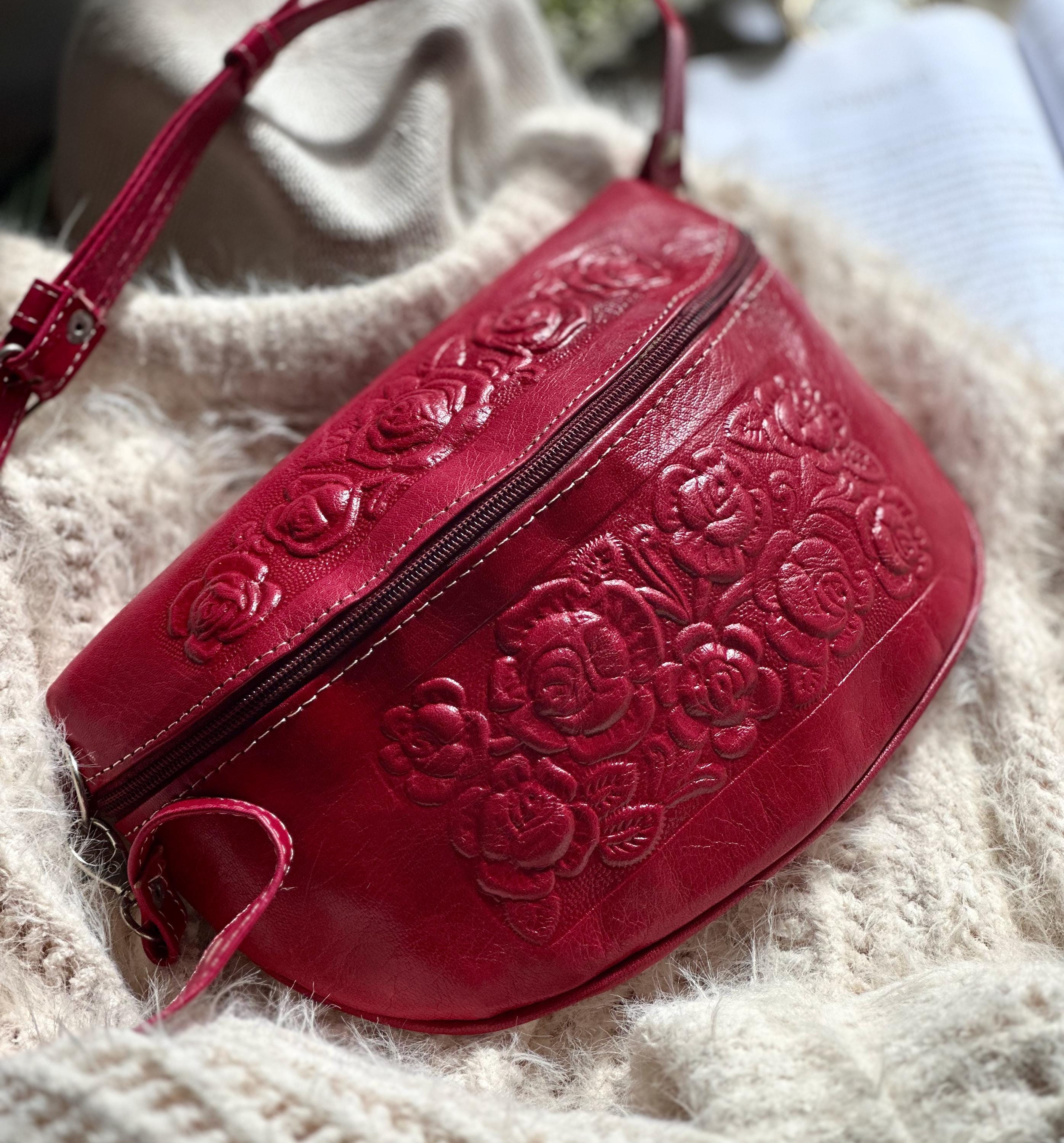 This embossed leather waist bag is a small-batch stunner - handmade from sustainable leather with embossed roses and a boho spirit.