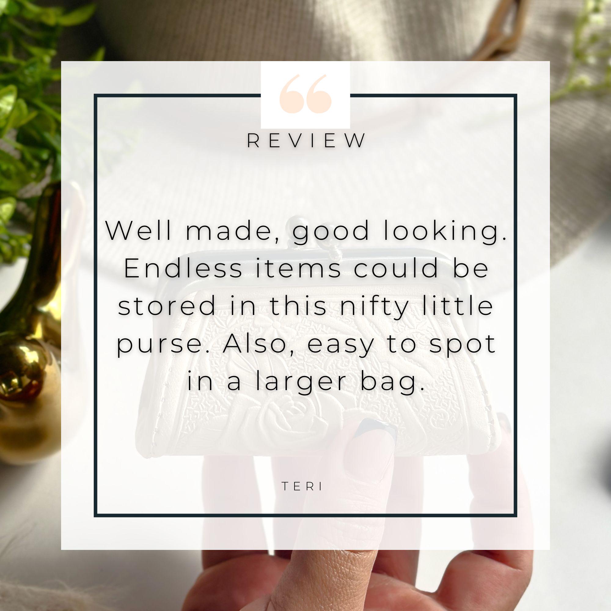 These embossed leather coin purses are perfect for loose change, as a small cosmetic bag, for travel size makeup, as a gift, for jewelry for earphones, for cellphone chargers, tampons or anything you want to be organized in your purse with a lot of color and style.