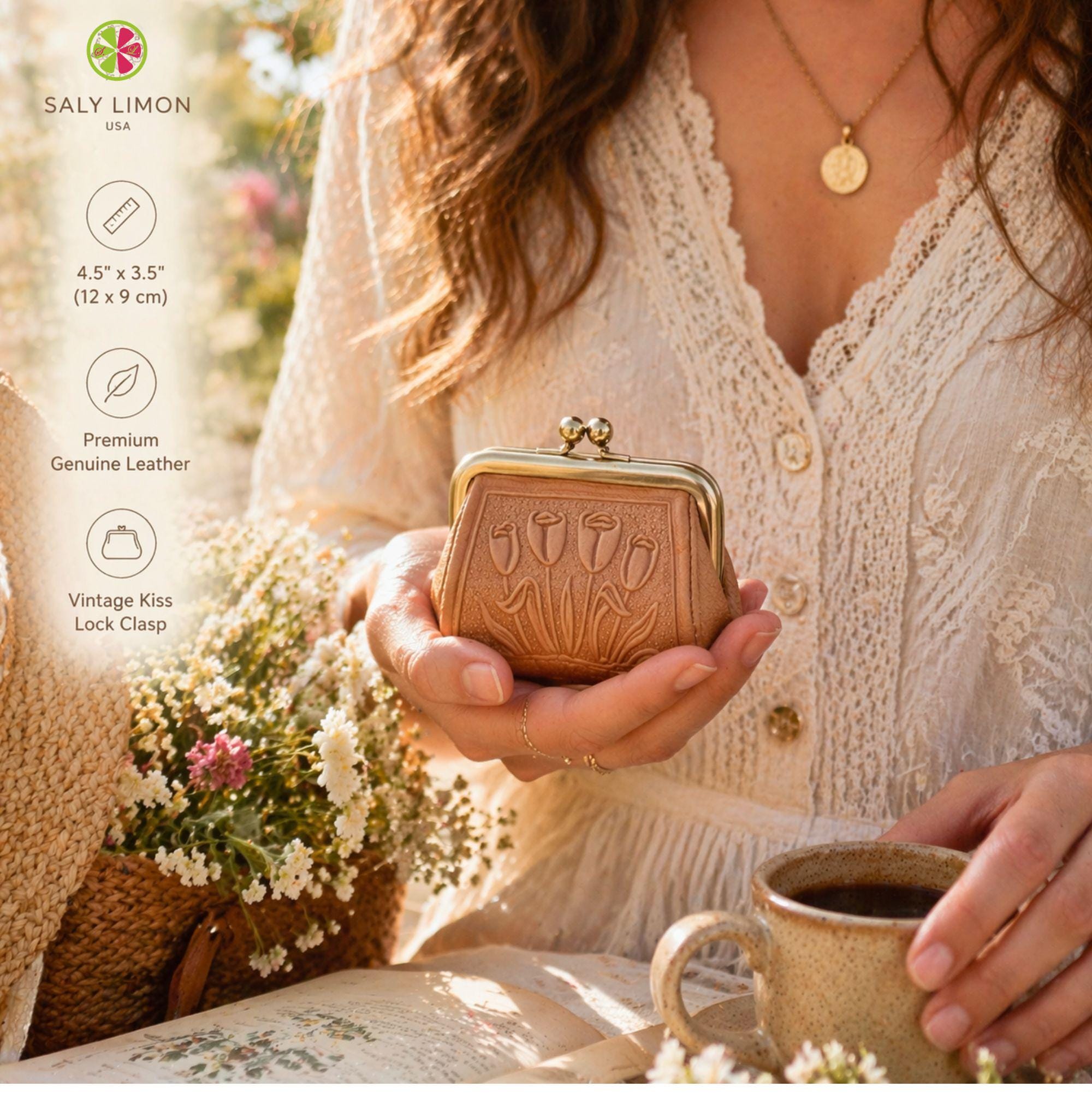 This vintage-style kiss lock coin purse is handcrafted from sustainable genuine leather and embossed with delicate tulips. Small enough to fit in the palm of your hand, it is perfect for coins, folded cash, earbuds, rings, lip balm, or the little essentials that always disappear at the bottom of your bag.