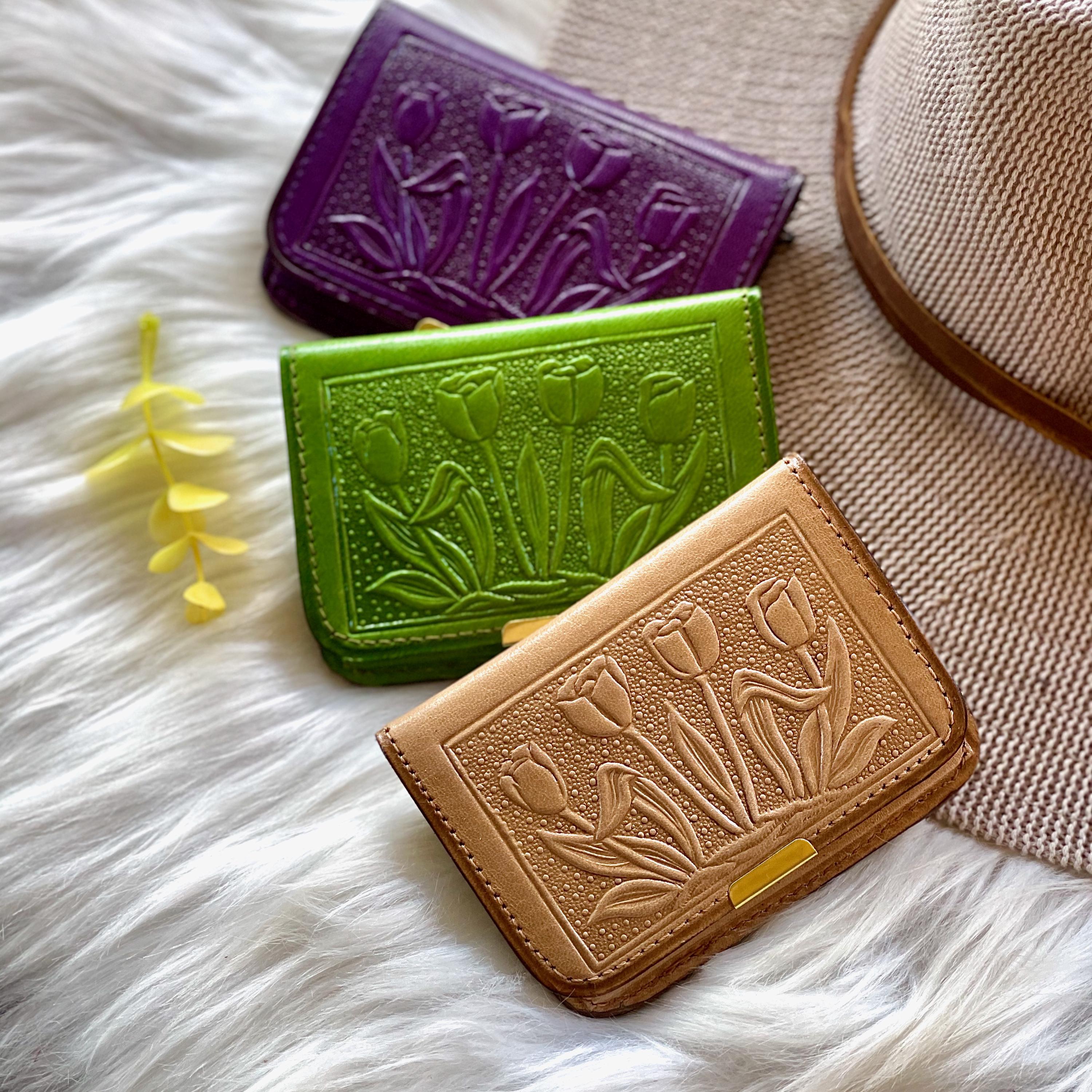 This slim leather wallet features an elegant embossed tulip design, rich bold color, and the option to personalize it with a custom engraving. A charming boho-cottagecore piece sheâll use every day - and treasure for years.