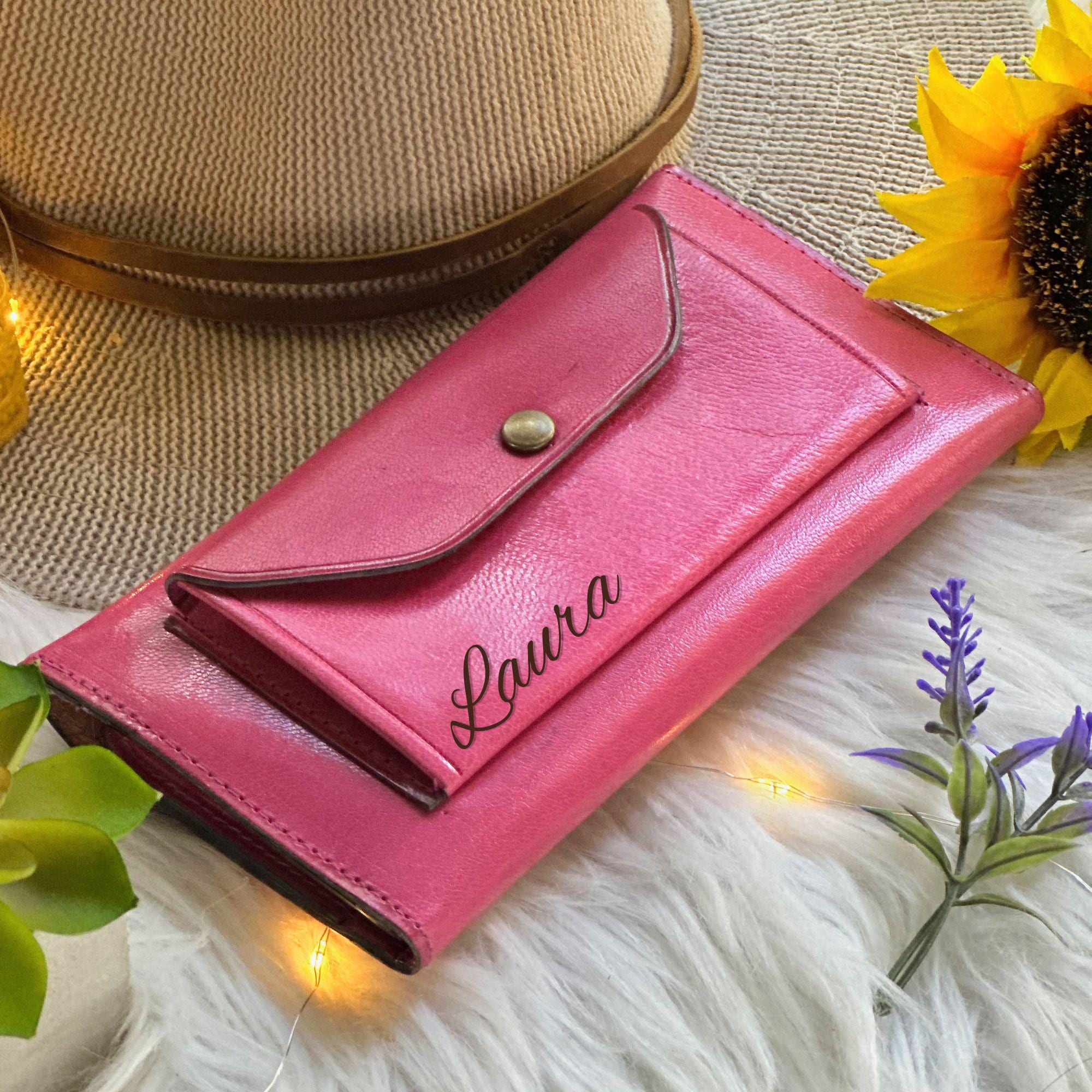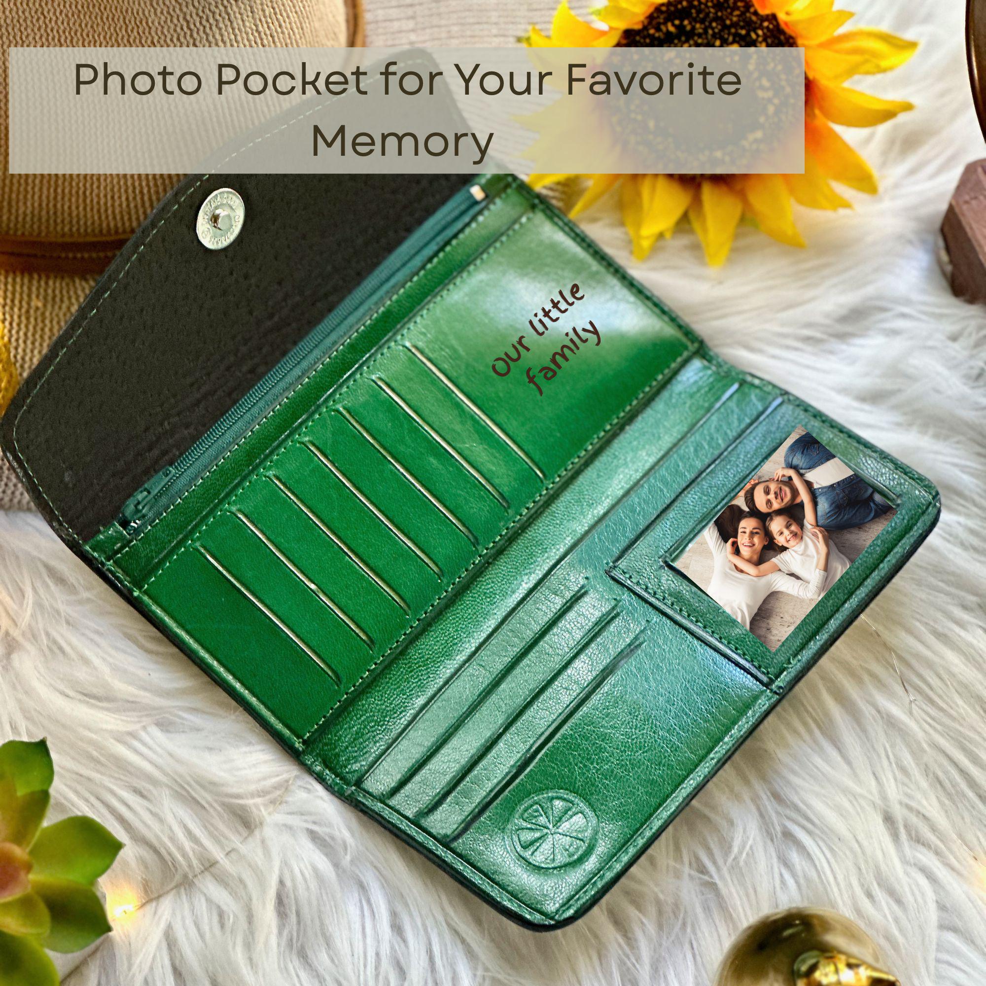 Handmade personalized calla lily wallet for women, crafted from sustainable goat leather and customized with your name, initials, or handwriting. A thoughtful gift for mom, wife, sister, birthdays, anniversaries, and Mother’s Day.