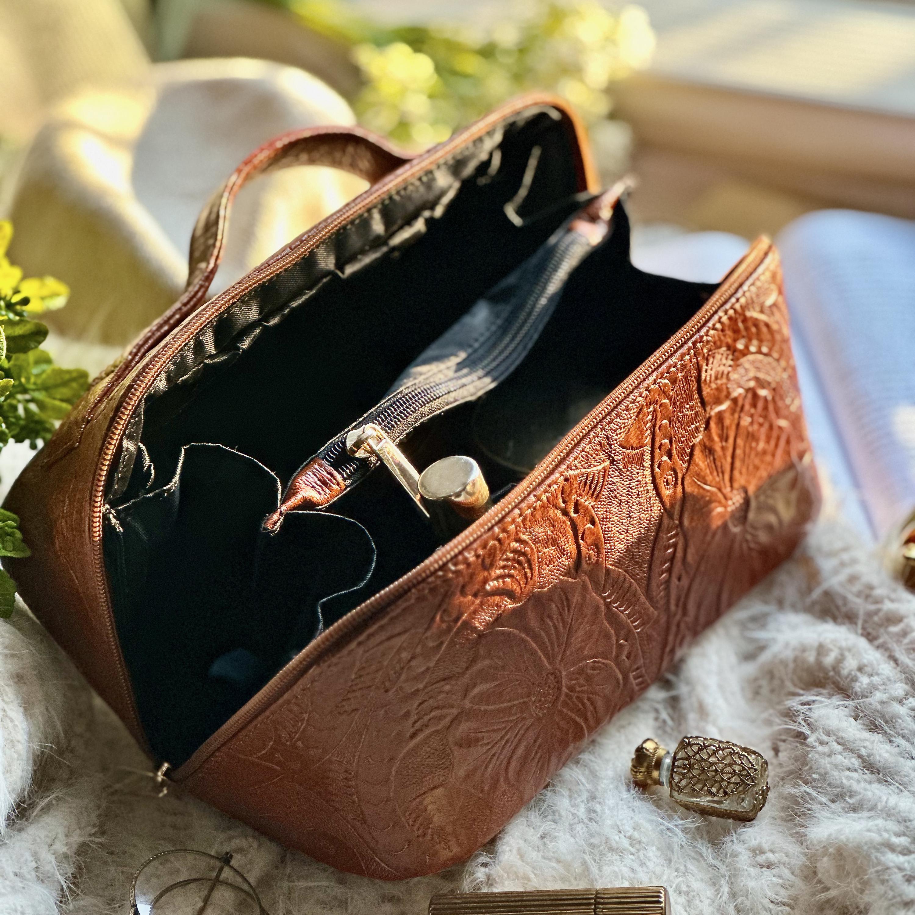 Stay organized in style with this floral embossed leather makeup bag. Designed with a spacious interior, multiple compartments, and an optional personalized name tag or monogram, it’s perfect for everyday use or travel.