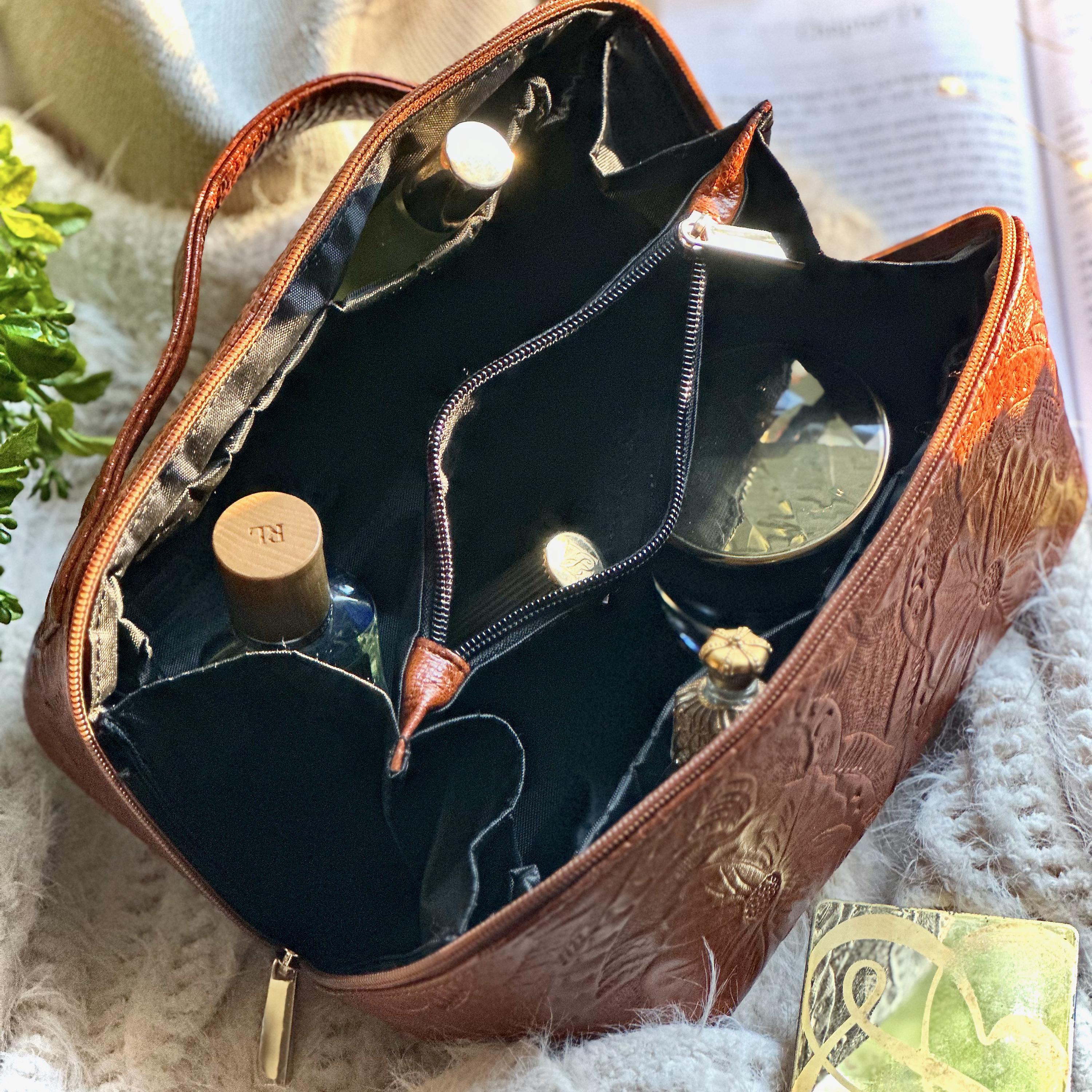 Excellent workmanship, quality material, love the smell of leather! Nice size makeup bag! Should hold all of my essentials! Highly recommend! You won’t be disappointed! Well worth the price!!