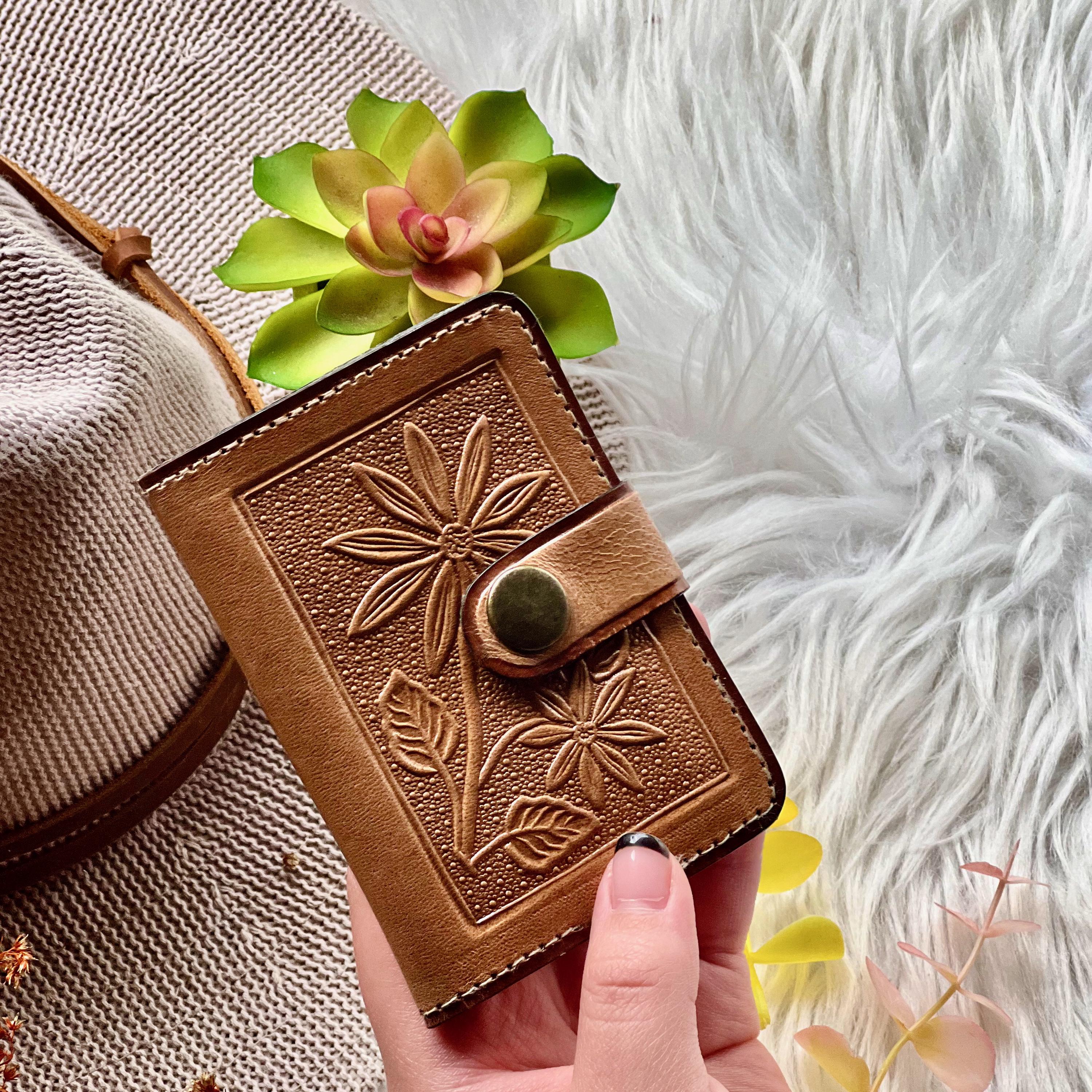 This slim, handcrafted card holder wallet is made from sustainable leather and embossed with floral patterns. With 8 card slots and an optional keyring add-on, it’s a beautiful way to keep your essentials close, whether in your bag or clipped to your lanyard.