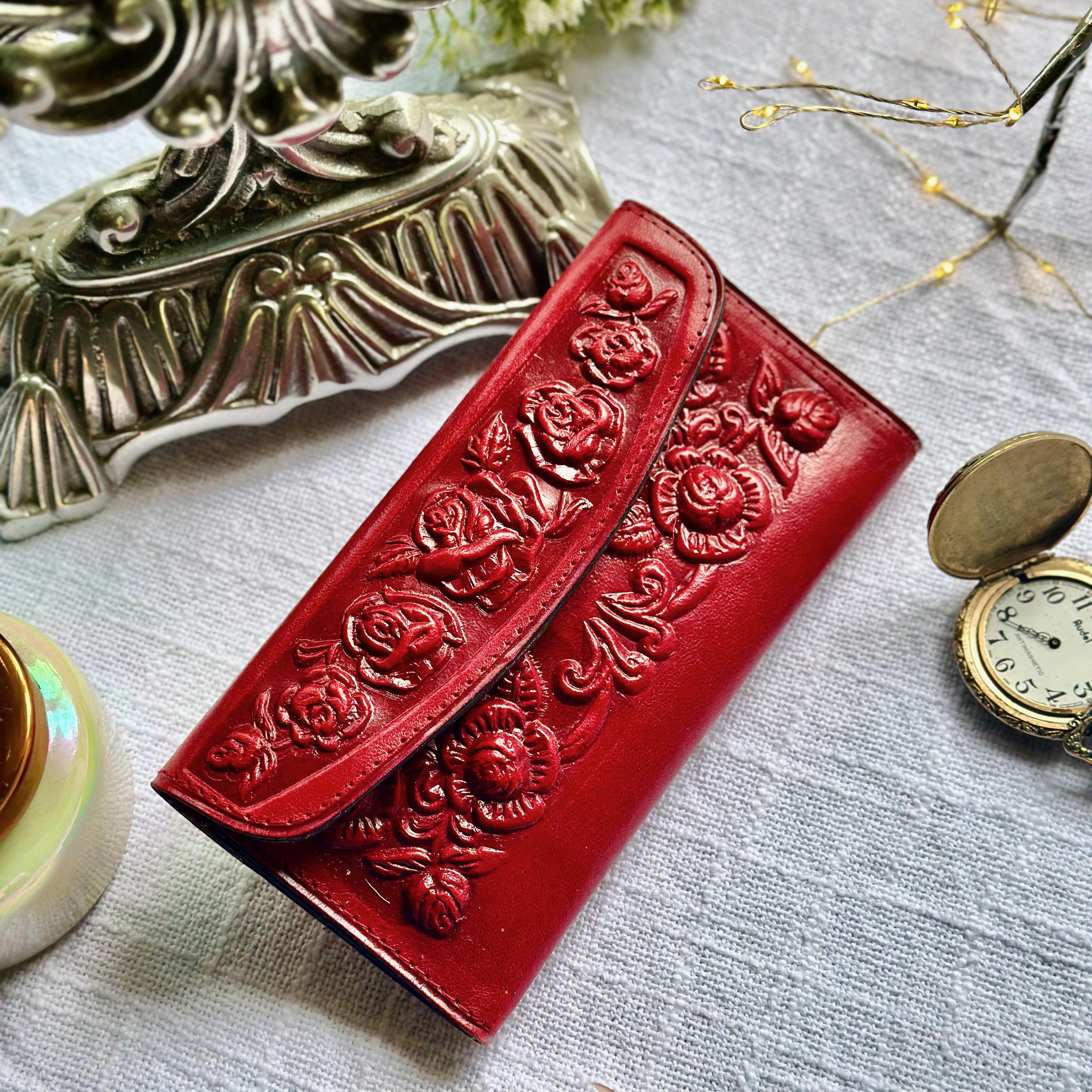 Turn heads with this red rose–embossed leather wallet, handmade with vintage charm and modern function. Crafted from sustainable leather, it’s slim yet roomy with card slots, a coin pocket, and a bill compartment. Personalize it with engraving to create a meaningful gift for her—perfect for birthdays, anniversaries, or Valentine’s Day.