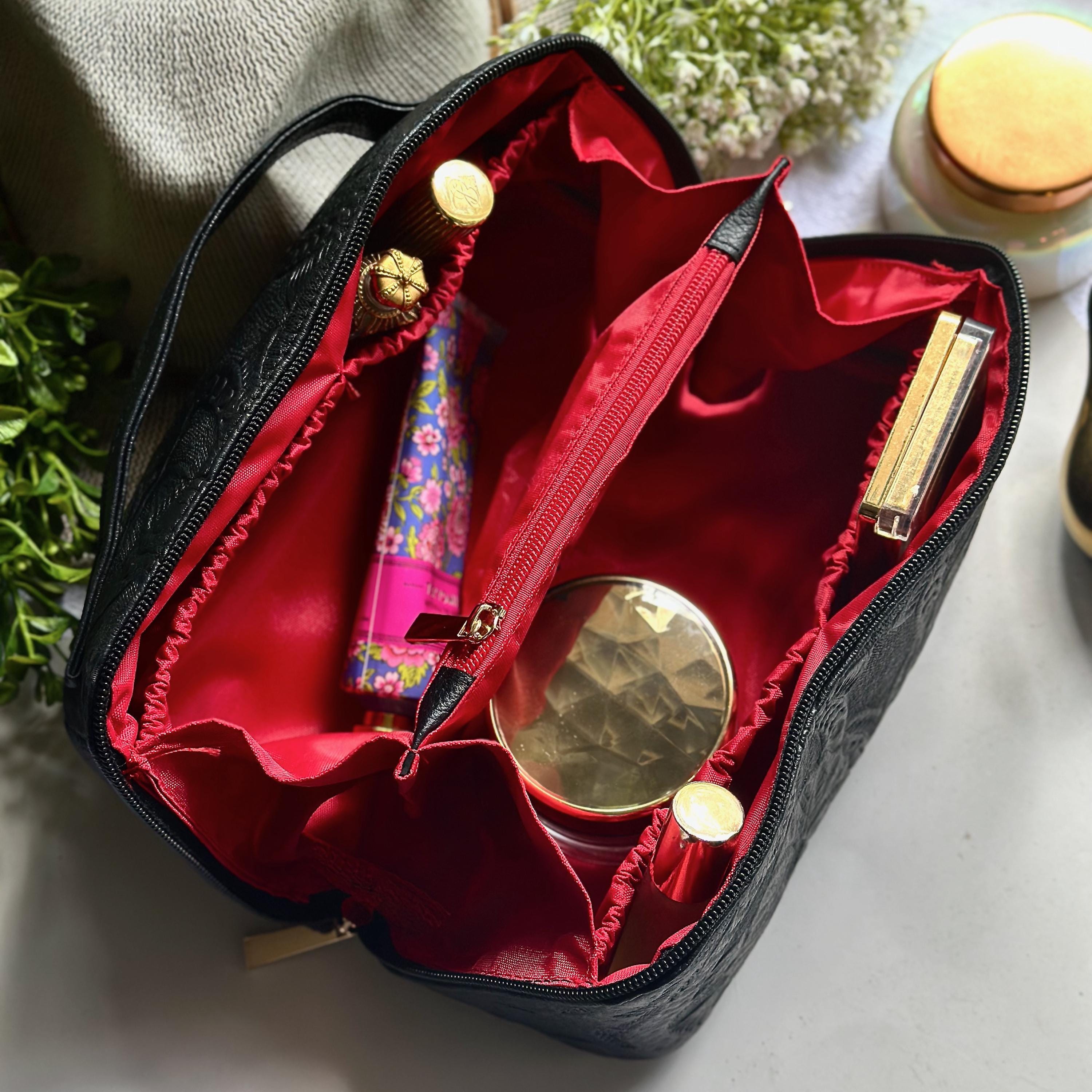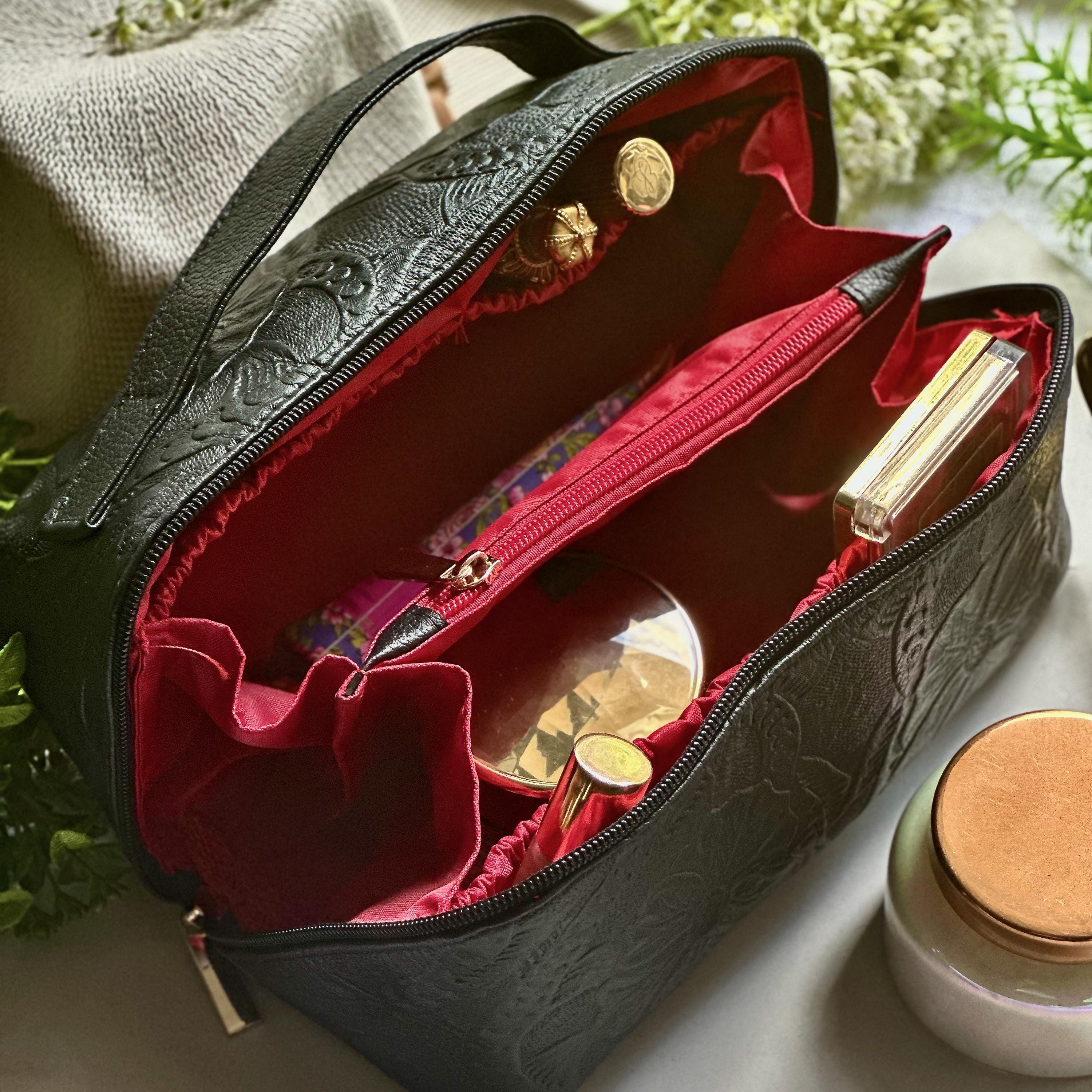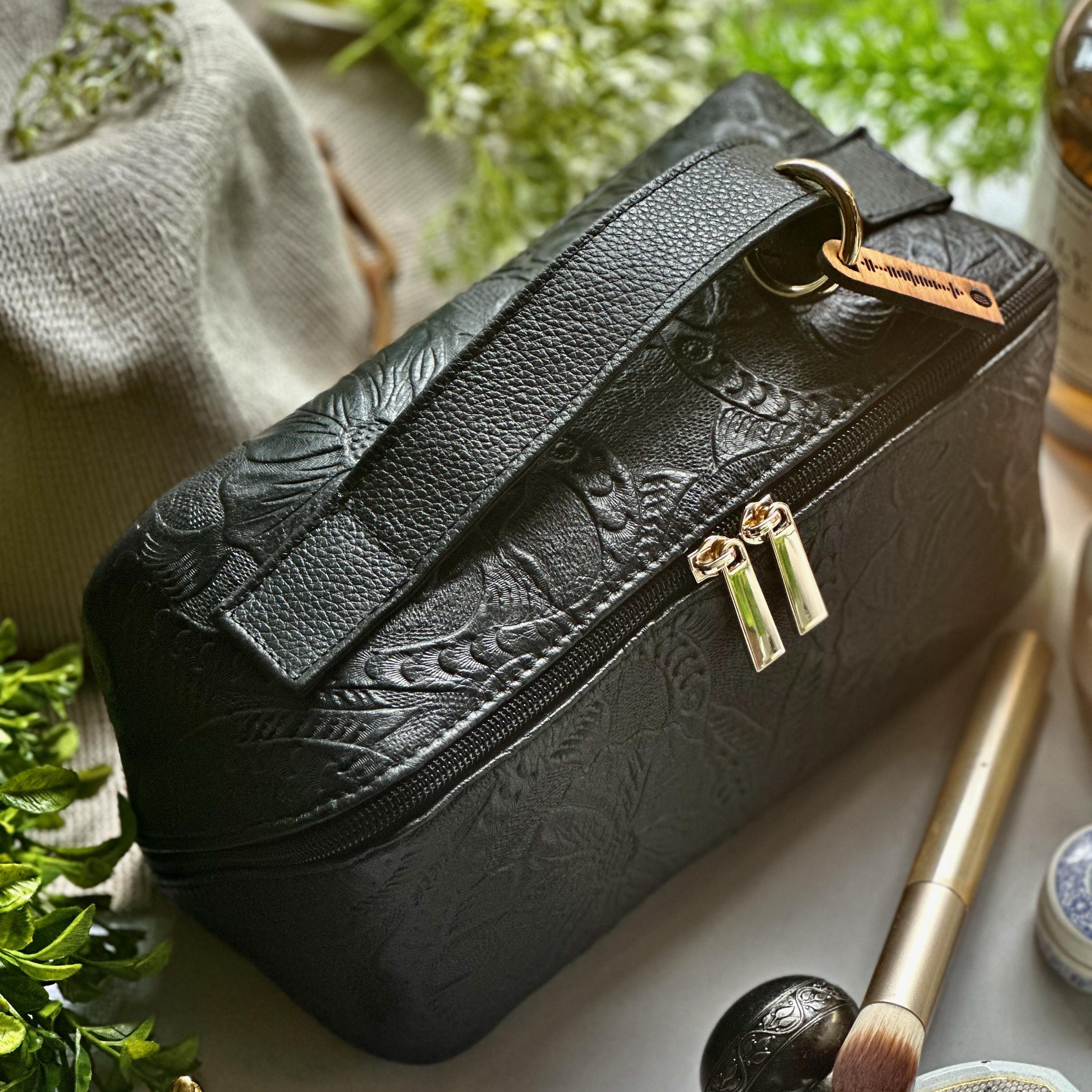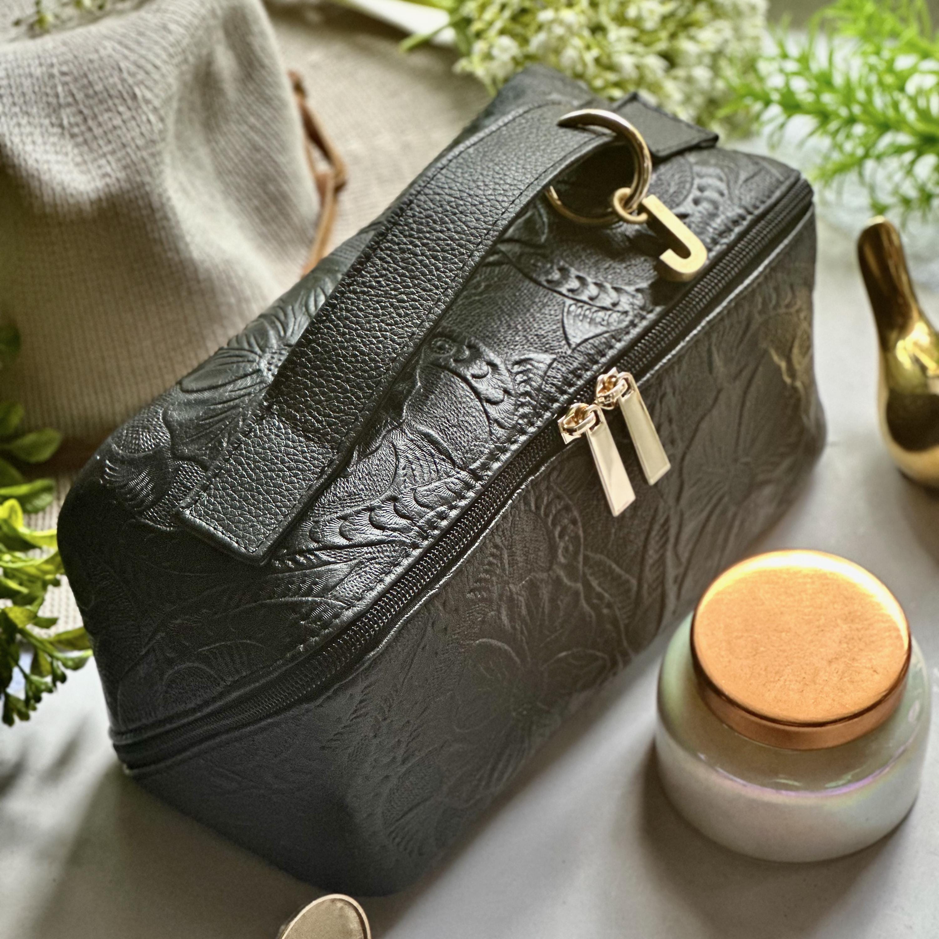 A personalized leather makeup bag organizer that’s as charming as it is functional.