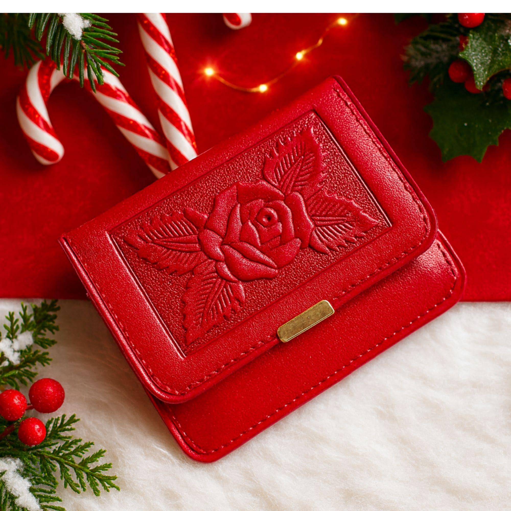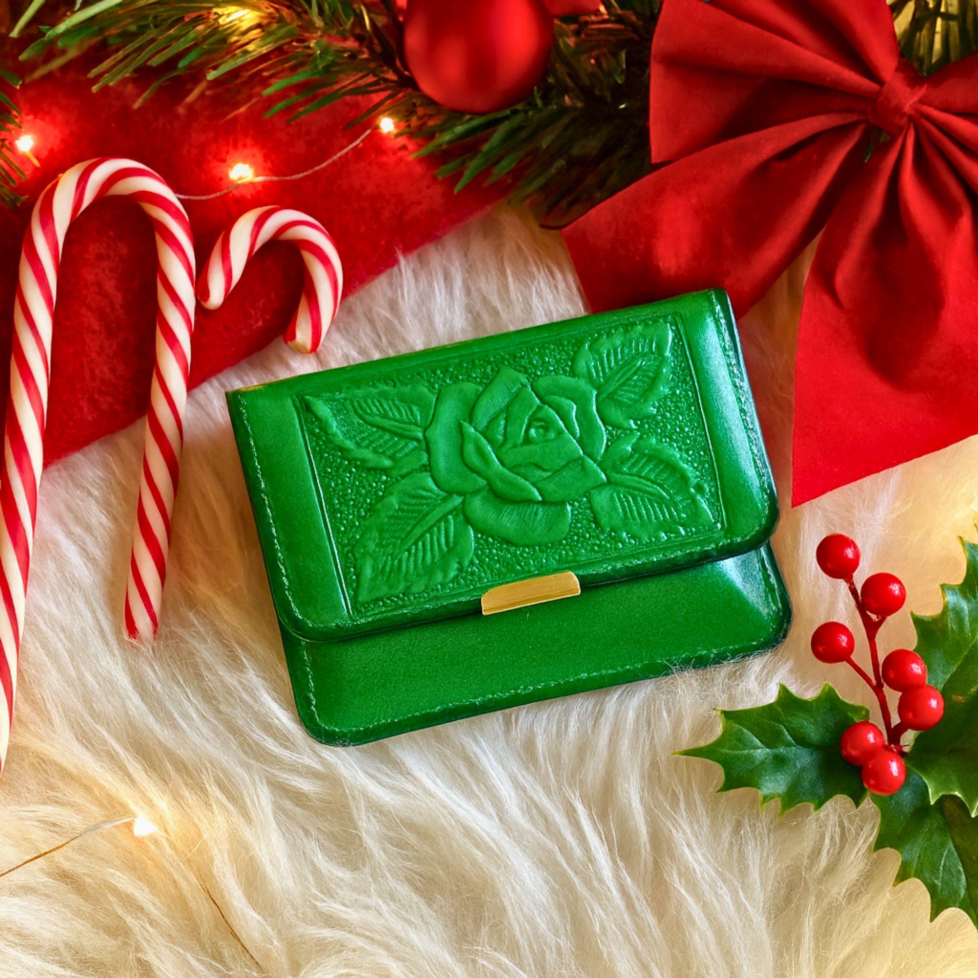 This handmade small leather wallet features floral embossing, festive colors, and space for essentials — all crafted from sustainable leather.