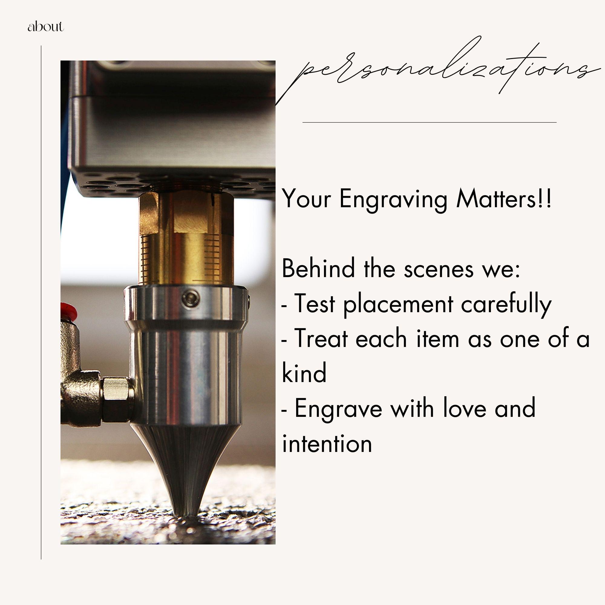All personalized items are final sale and cannot be returned or exchanged. Please double-check spelling, dates, and any custom details before placing your order. If you have questions or need help adding a message, we’re happy to assist before engraving begins!