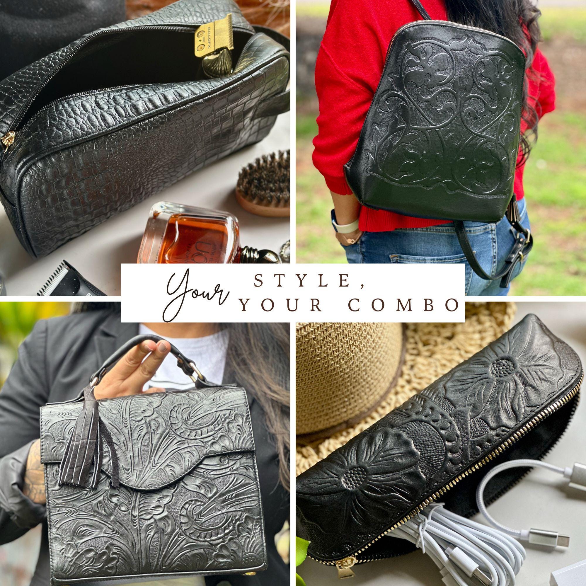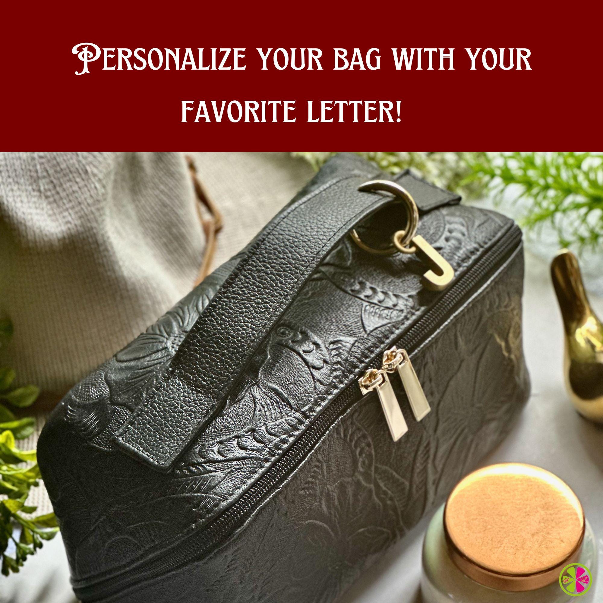 For the women who love dark elegance and timeless craftsmanship - this embossed black leather makeup bag brings together beauty, function, and just a touch of mystery. Deep black sustainable leather on the outside, bold red lining on the inside… a dramatic combination that feels luxurious every time you open it.