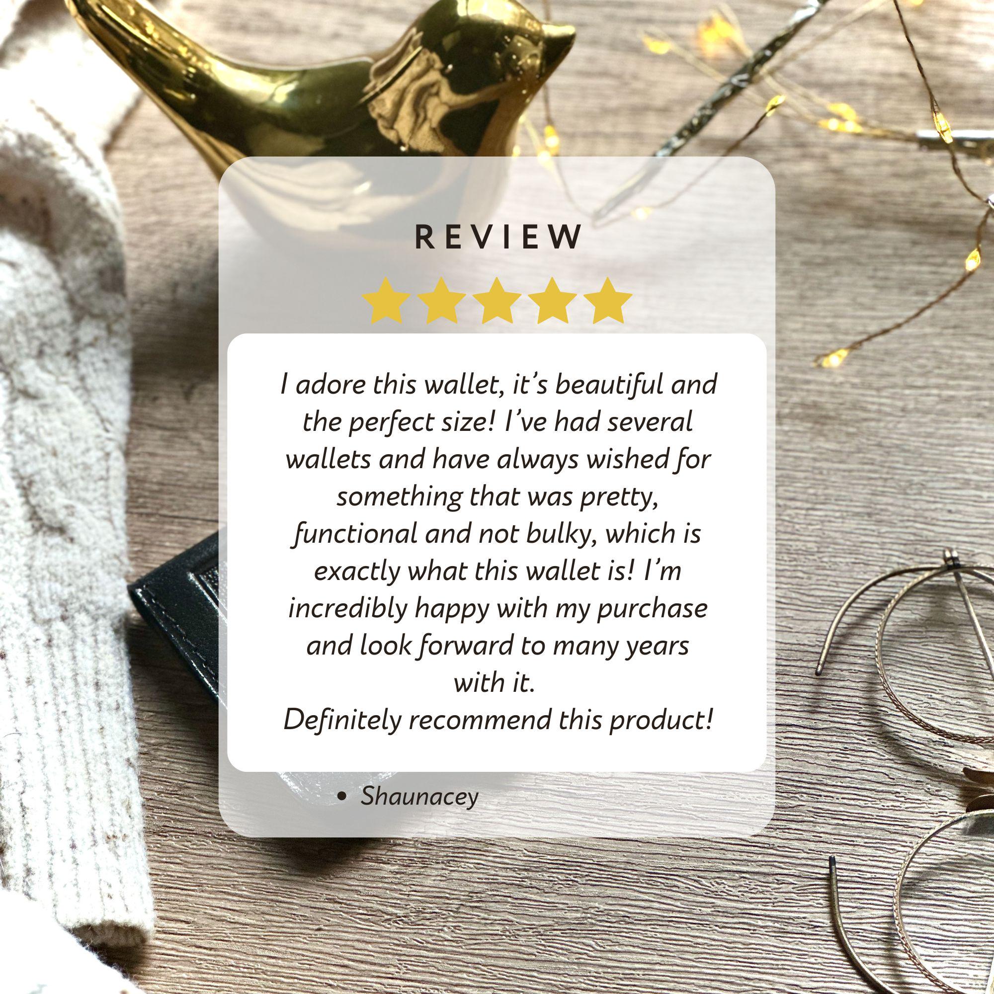I adore this wallet, it’s beautiful and the perfect size! I’ve had several wallets and have always wished for something that was pretty, functional and not bulky, which is exactly what this wallet is! I’m incredibly happy with my purchase and look forward to many years with it. Definitely recommend this product!