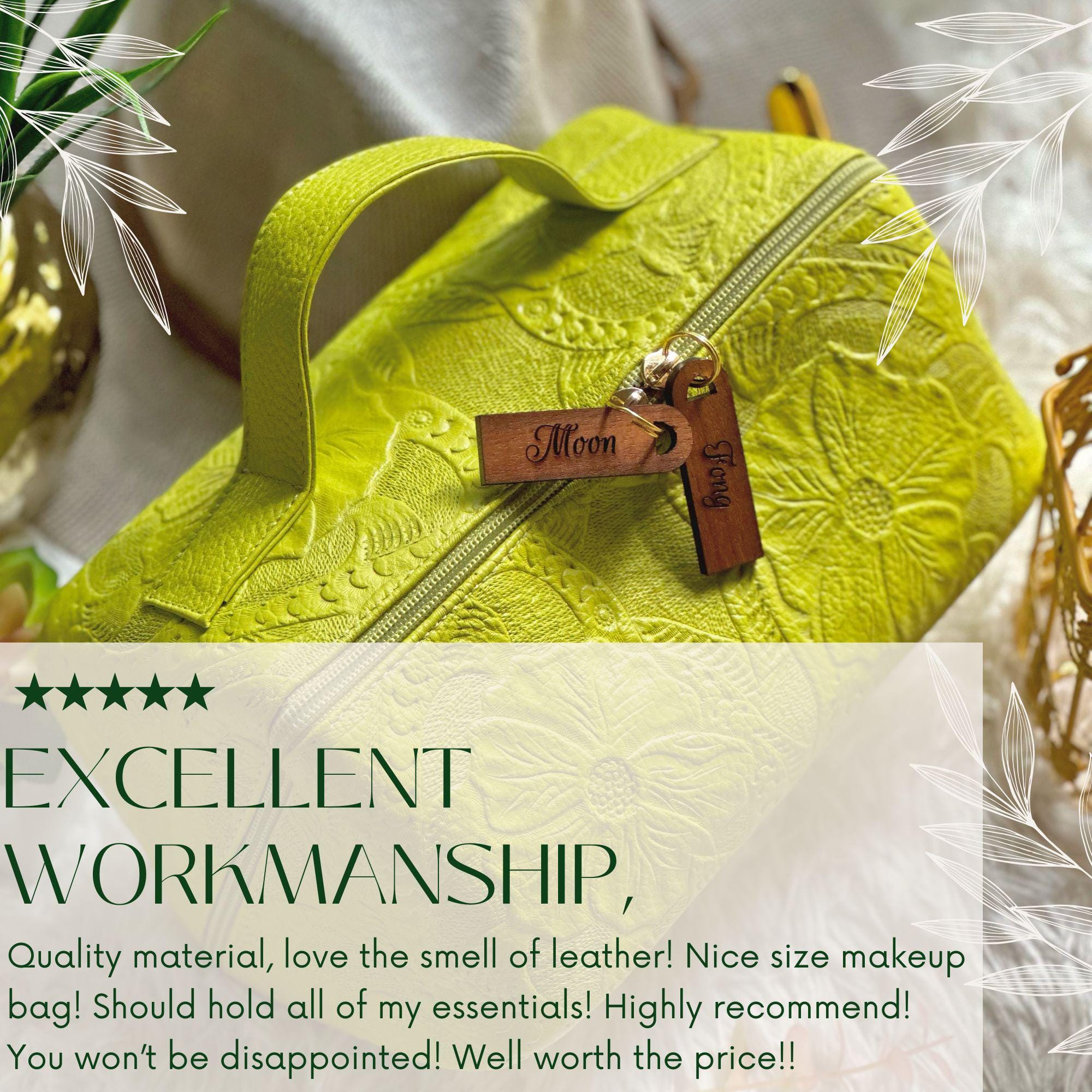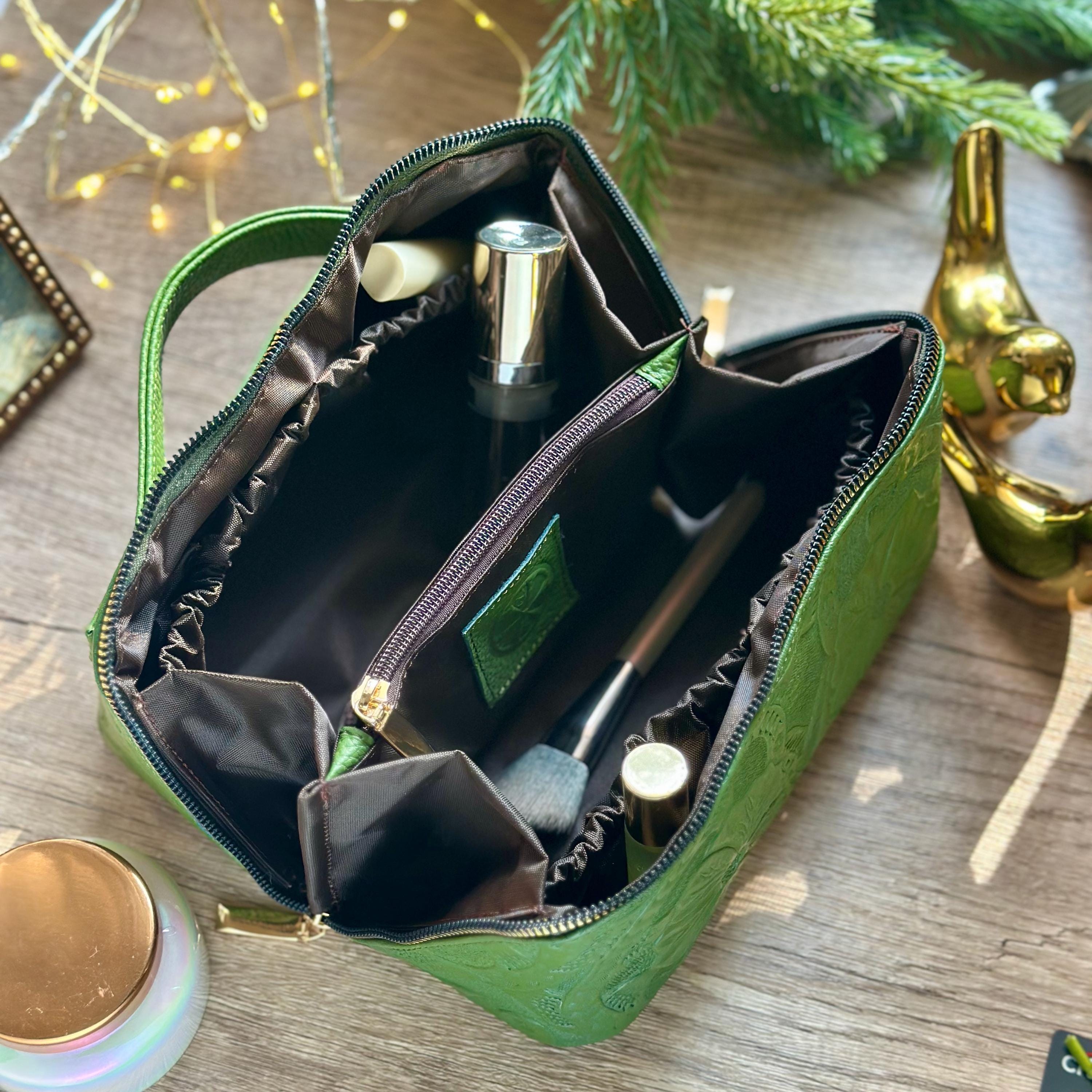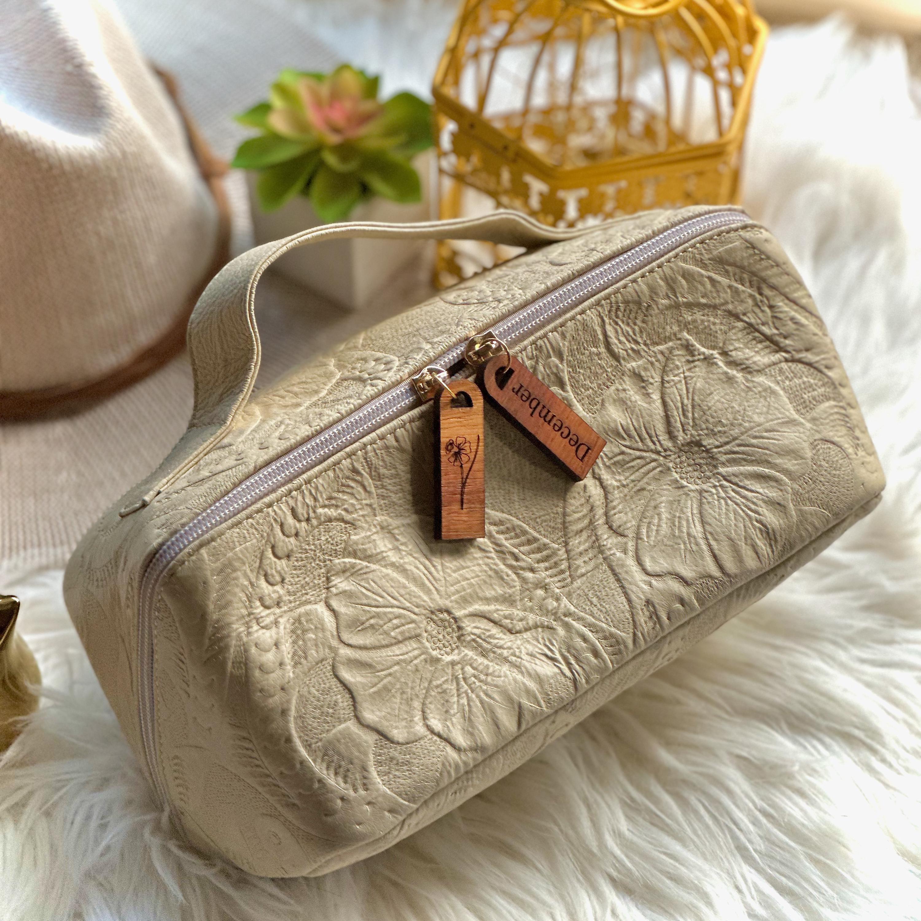 These earthy tones were designed for women who love nature-inspired beauty. Each embossed flower is carved by hand, making every bag unique - no two pieces will ever look the same. The structured design holds full-size skincare, brushes, and essentials, making it perfect for travel or everyday use. Add initials or a charm to create a meaningful personalized gift.