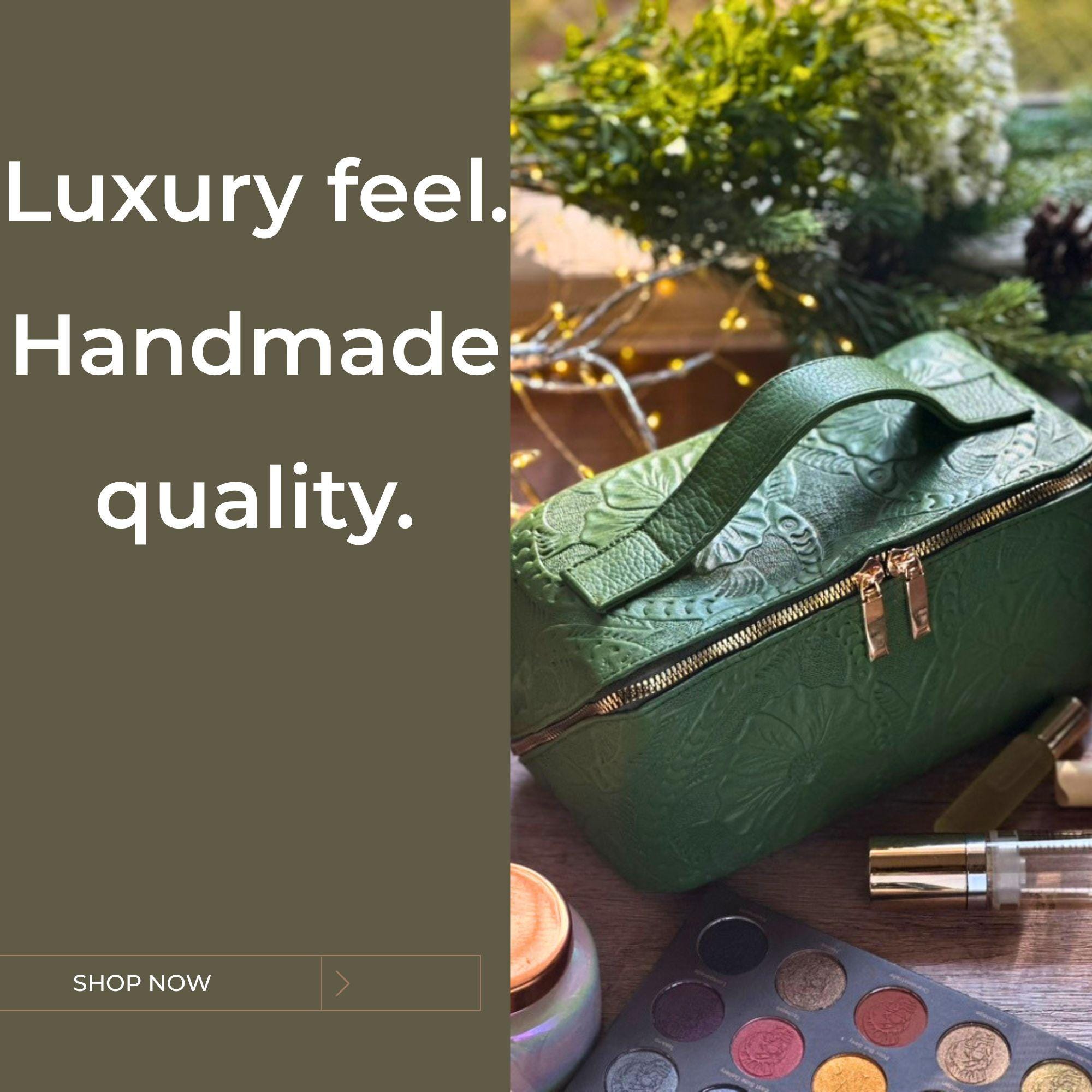 Each embossed flower is carved by hand, and the structured design holds full-size skincare, brushes, and daily essentials â making it perfect for both travel and everyday use.