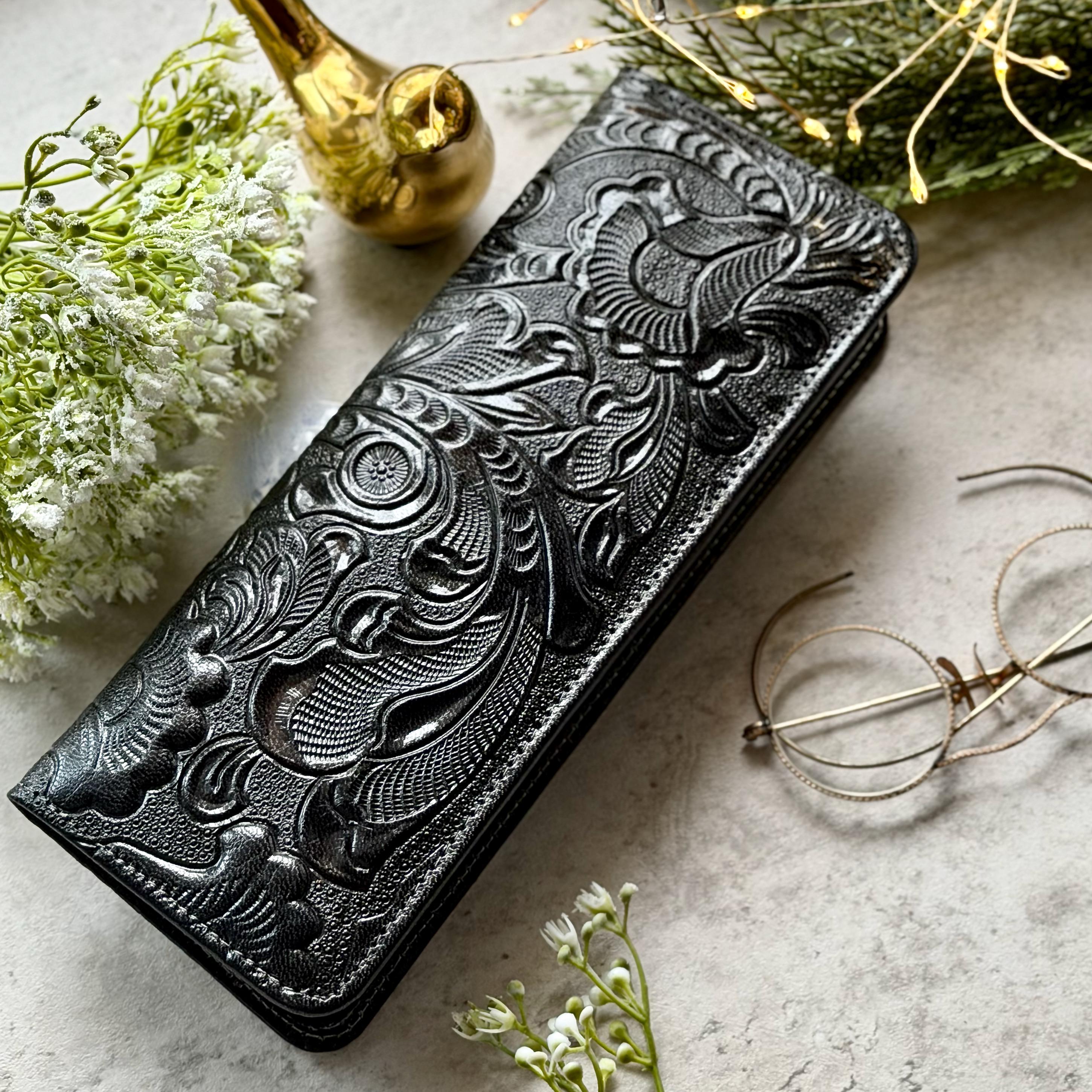 This tooled leather checkbook wallet is handcrafted from sustainable leather, featuring a floral design that feels both vintage and bohemian.