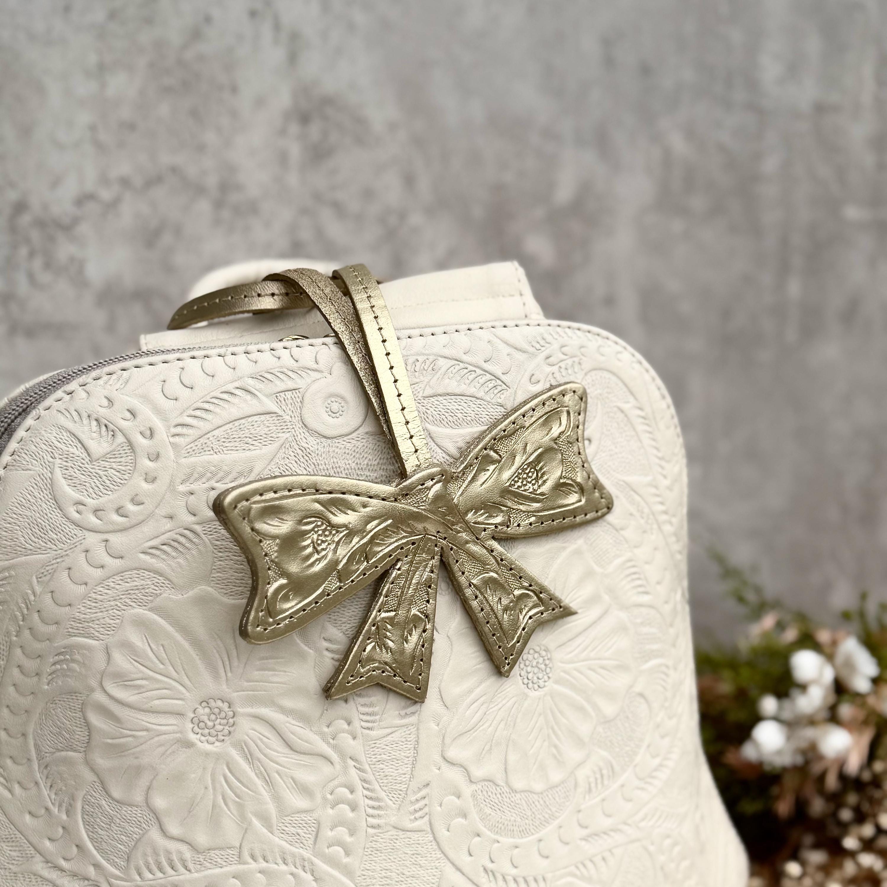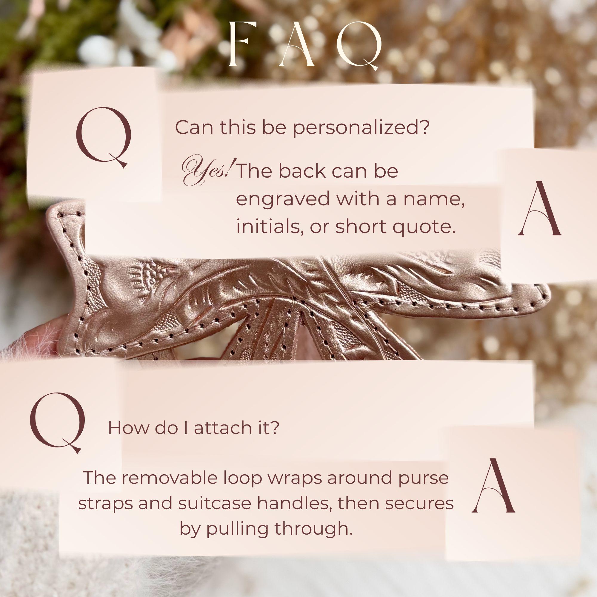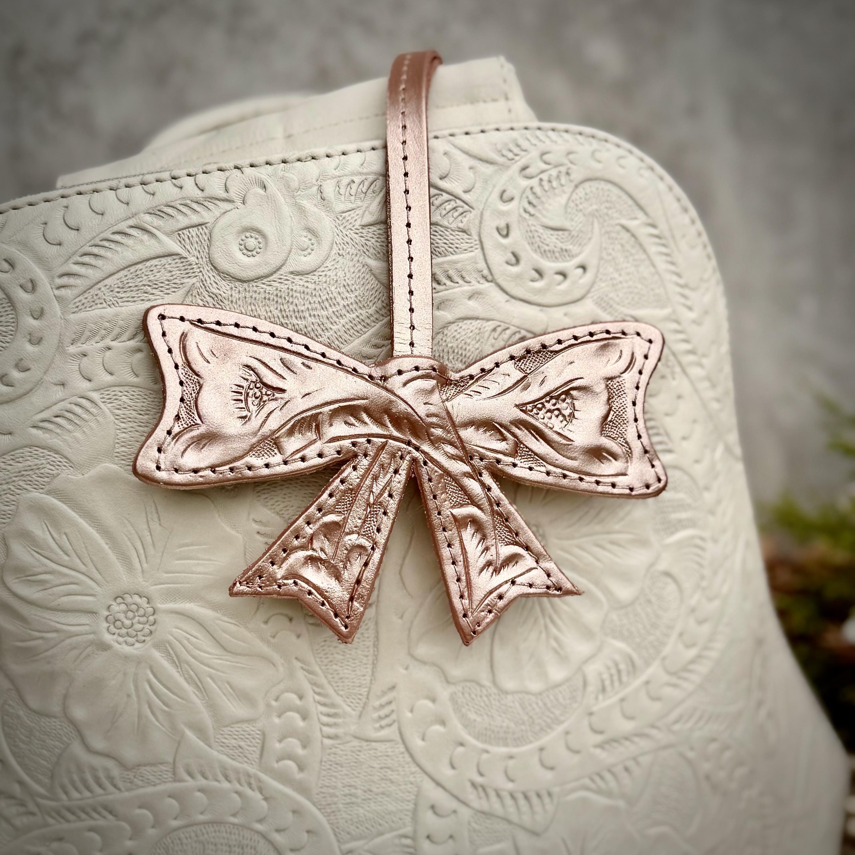 Each bow is individually hand-tooled and made from genuine leather, making every piece one of a kind. The removable loop wraps easily around purse straps and suitcase handles, then pulls through to secure. Lightweight, elegant, and easy to move from one bag to another.