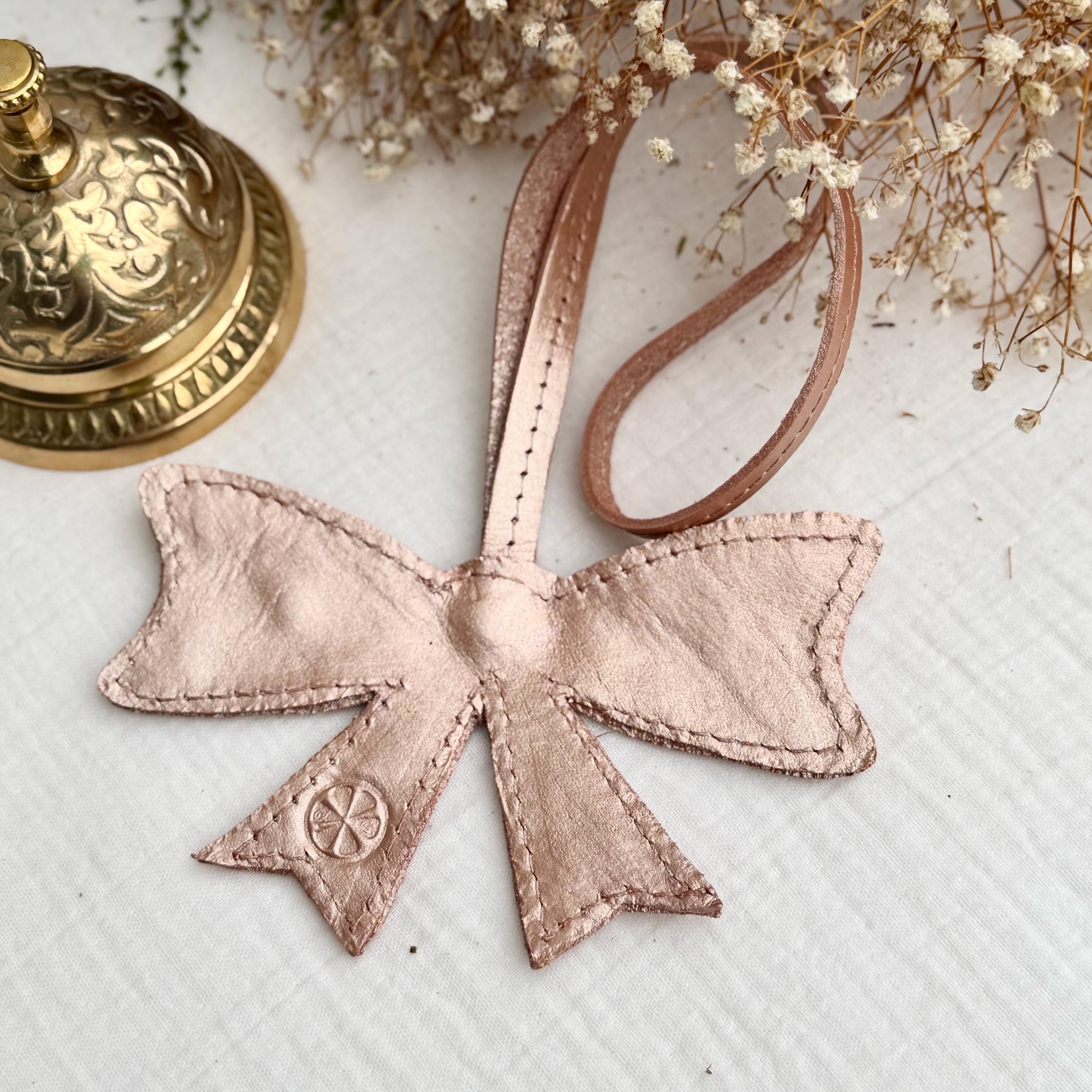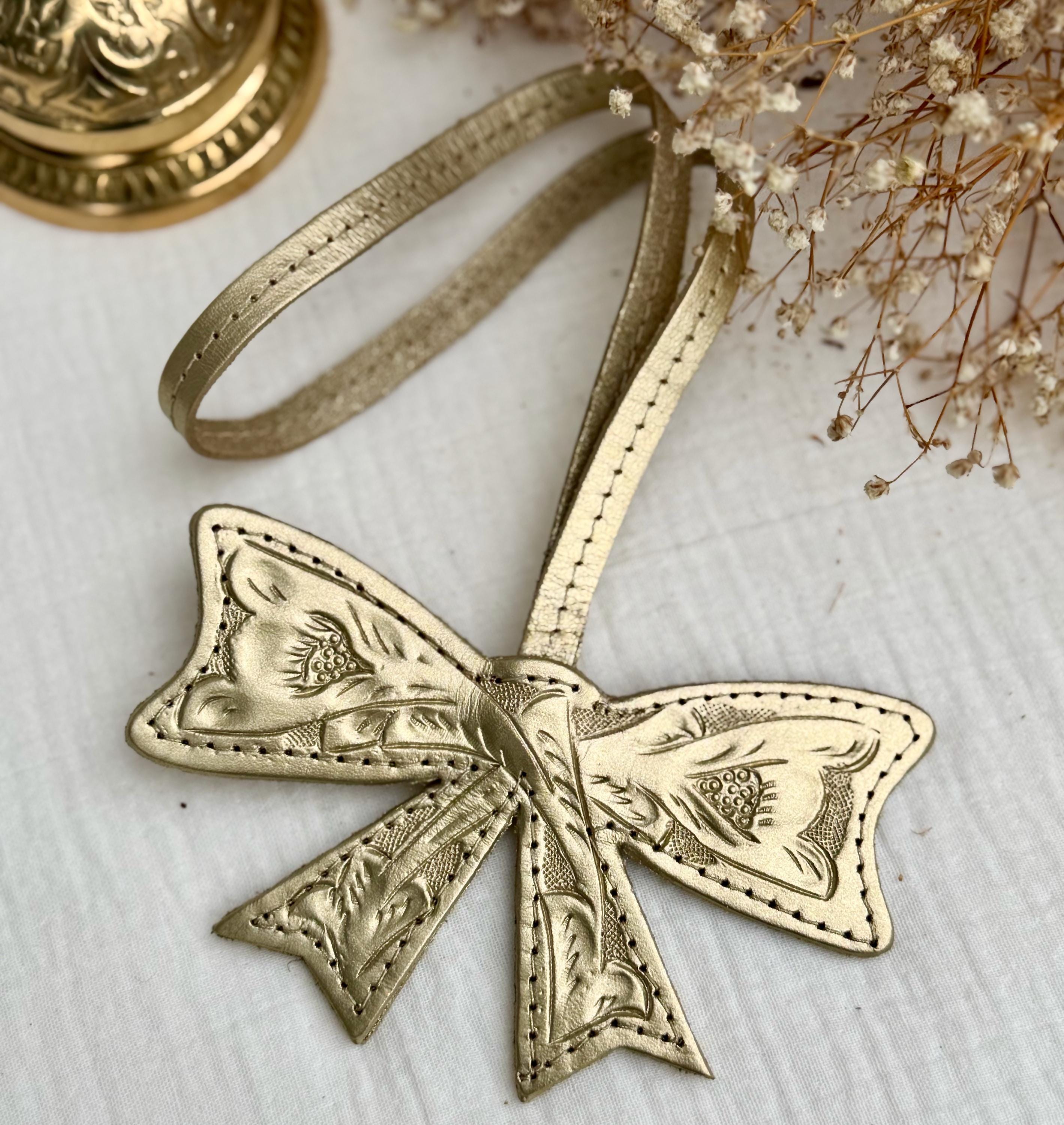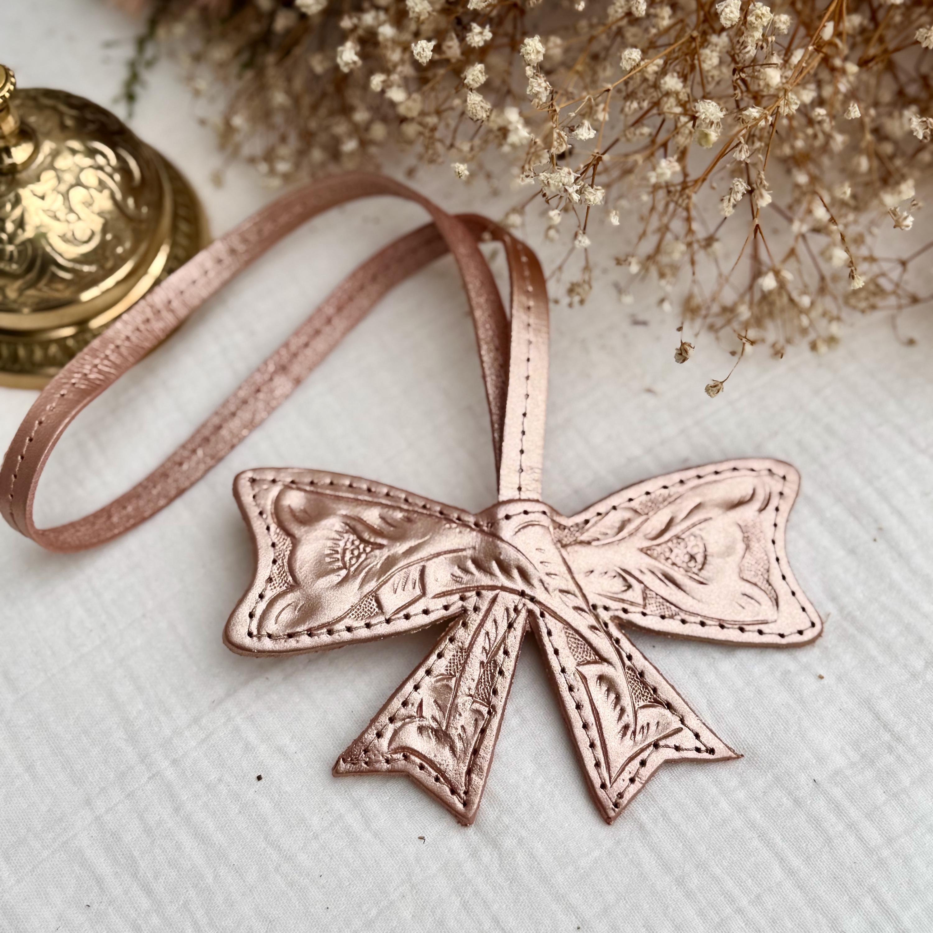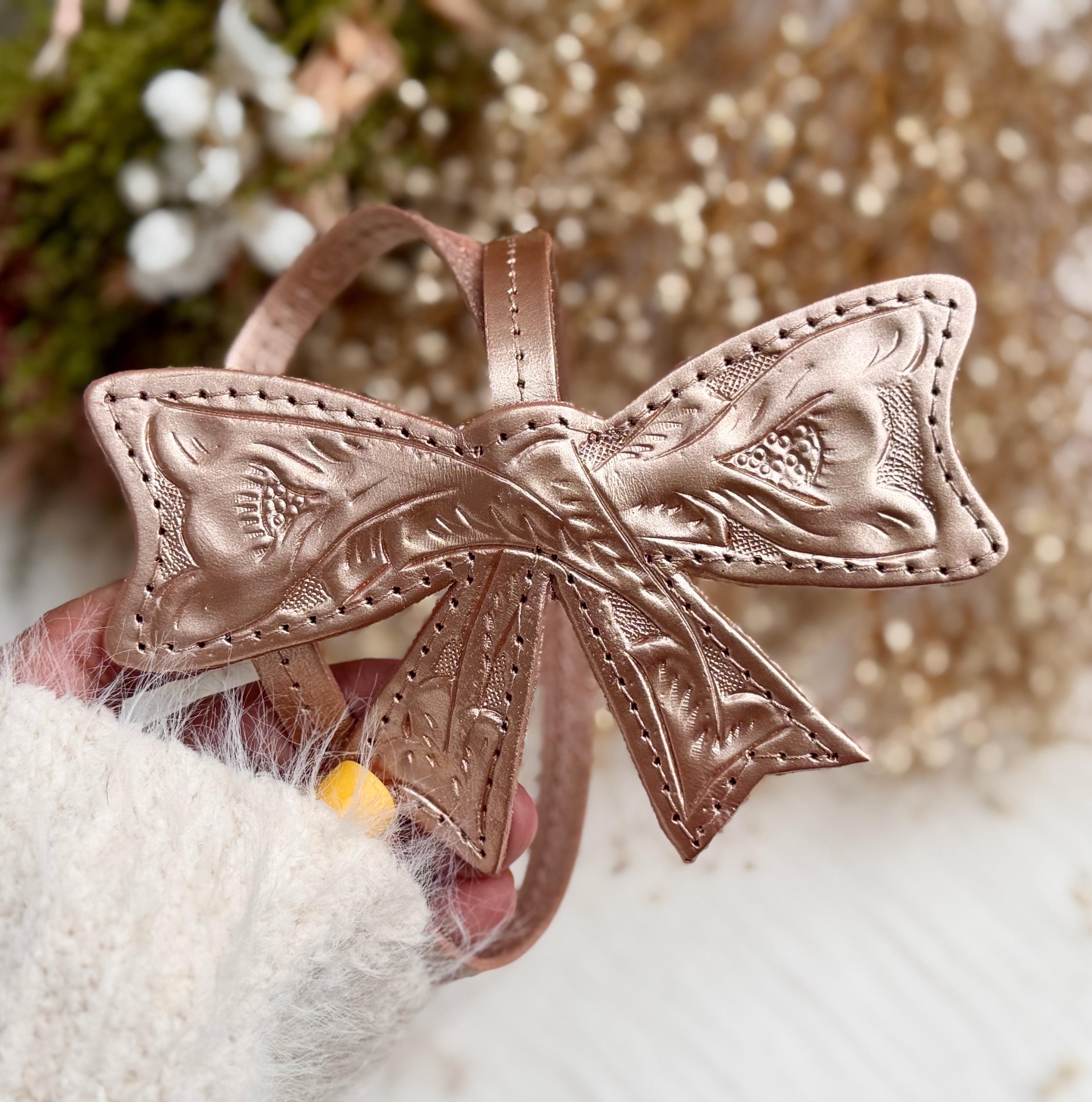 Each bow is individually hand-tooled and made from genuine leather, making every piece one of a kind. The removable loop wraps easily around purse straps and suitcase handles, then pulls through to secure. Lightweight, elegant, and easy to move from one bag to another.
