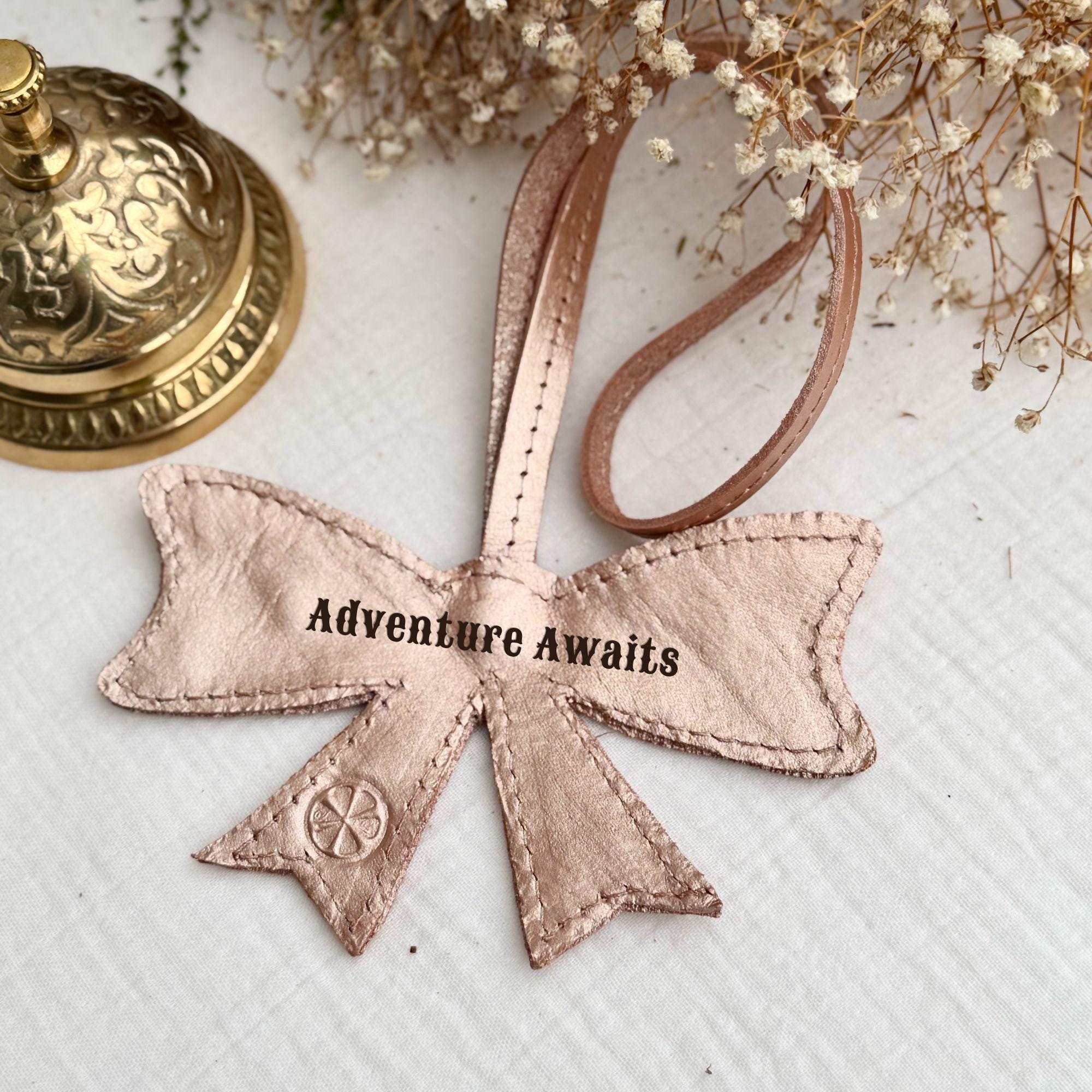 Travel beautifully with this hand-tooled leather bow that can be used as either a decorative luggage tag or a removable purse charm. Attach it to your suitcase, handbag, tote, backpack, or travel bag to add a unique handcrafted touch.