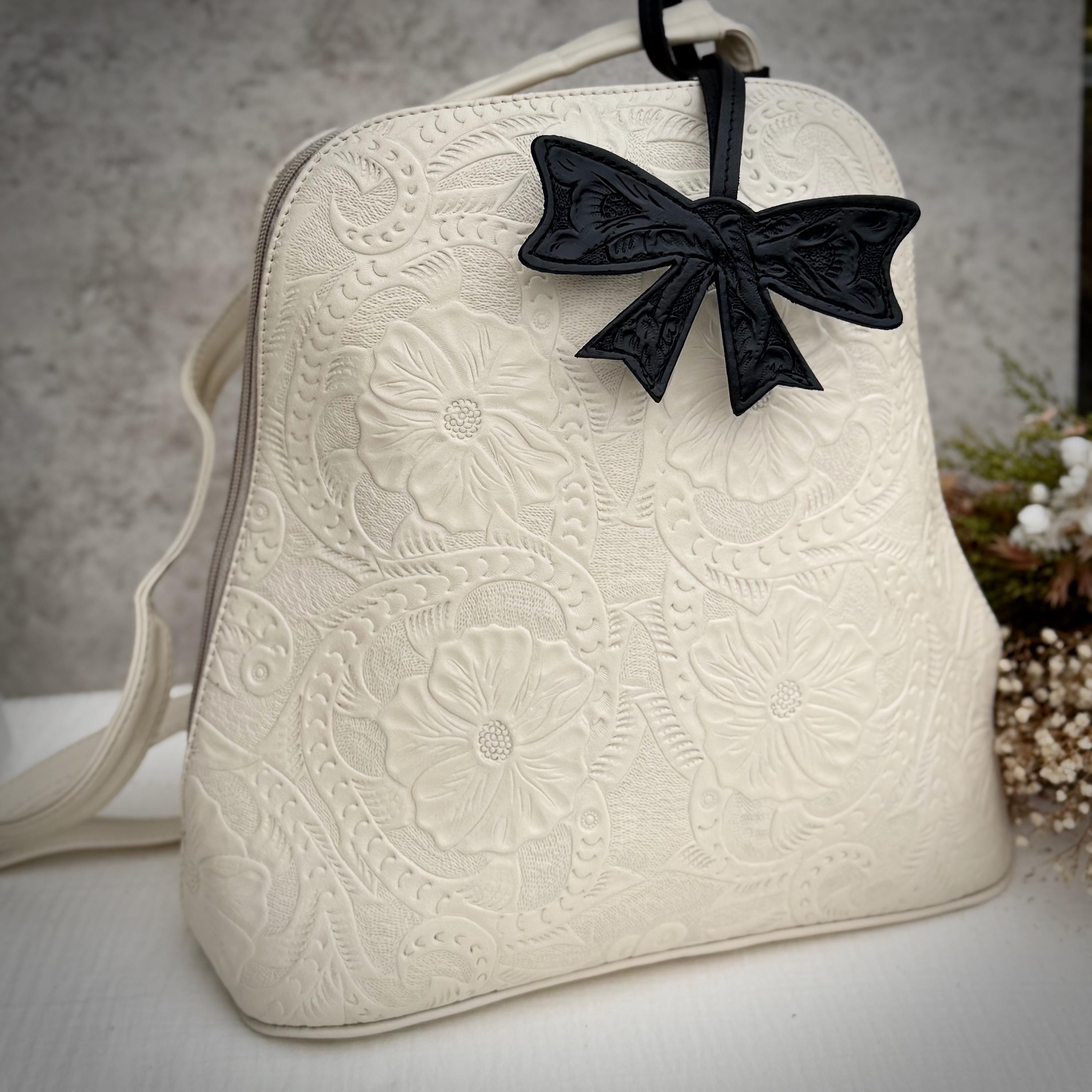 Travel beautifully with this hand-tooled leather bow that can be used as either a decorative luggage tag or a removable purse charm. Attach it to your suitcase, handbag, tote, backpack, or travel bag to add a unique handcrafted touch.