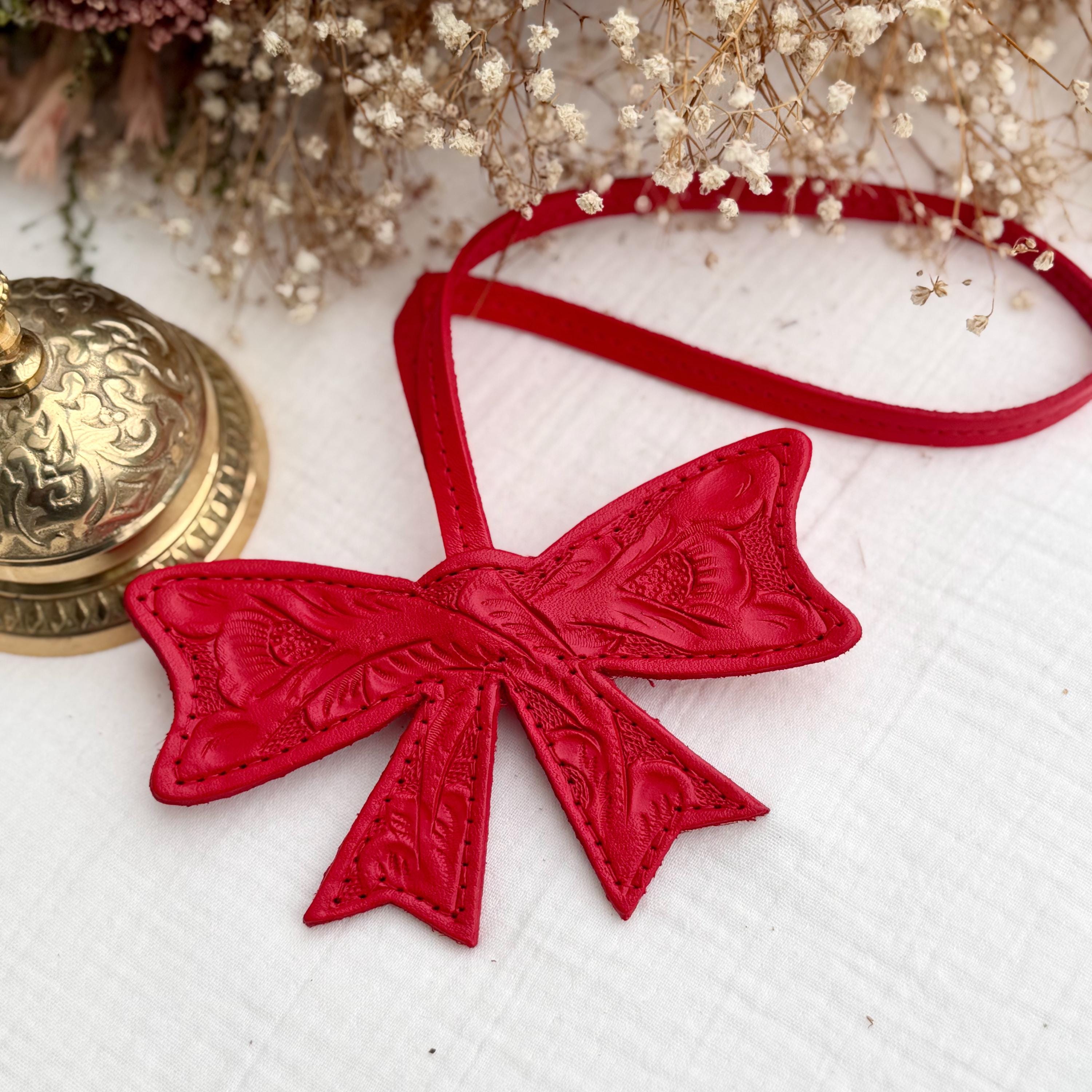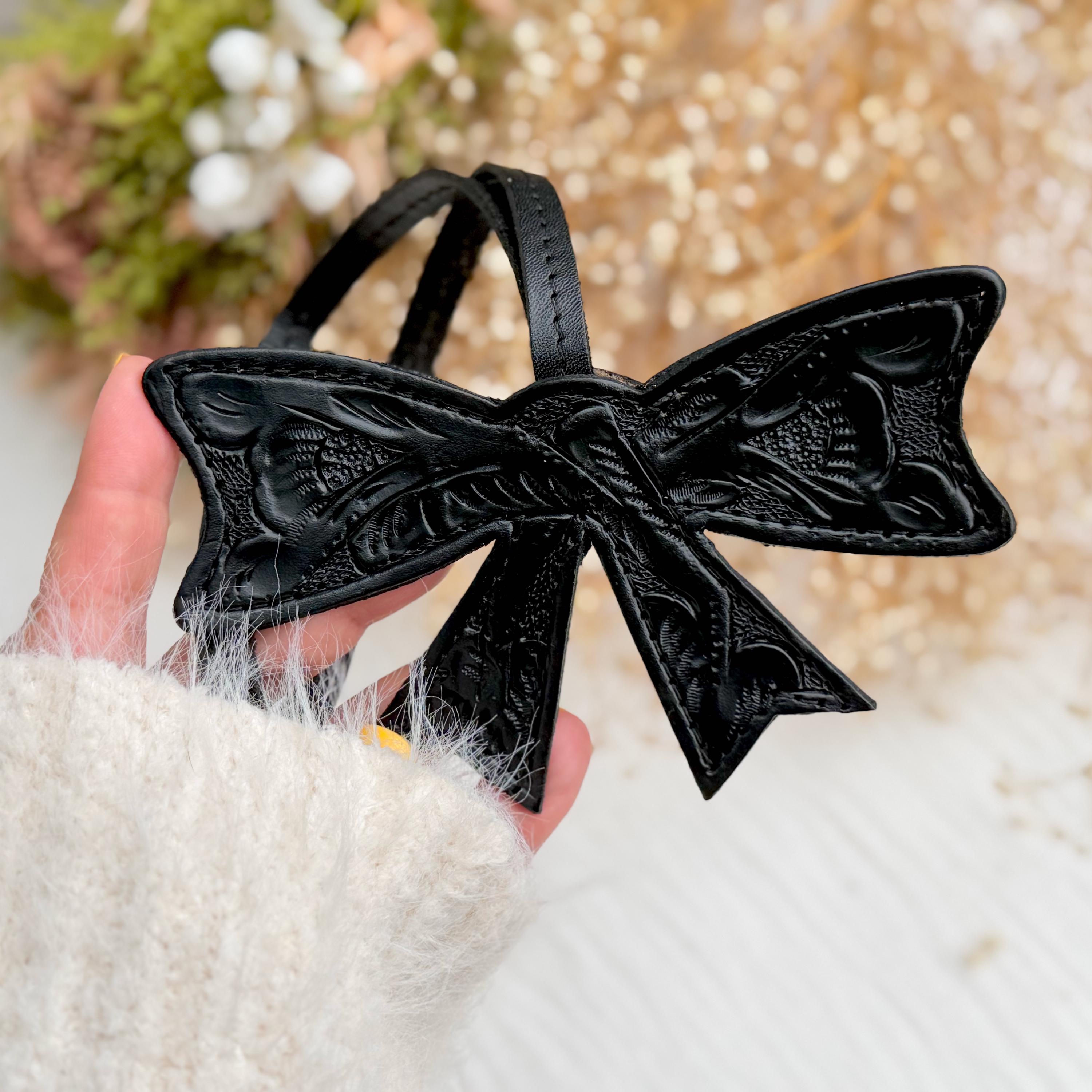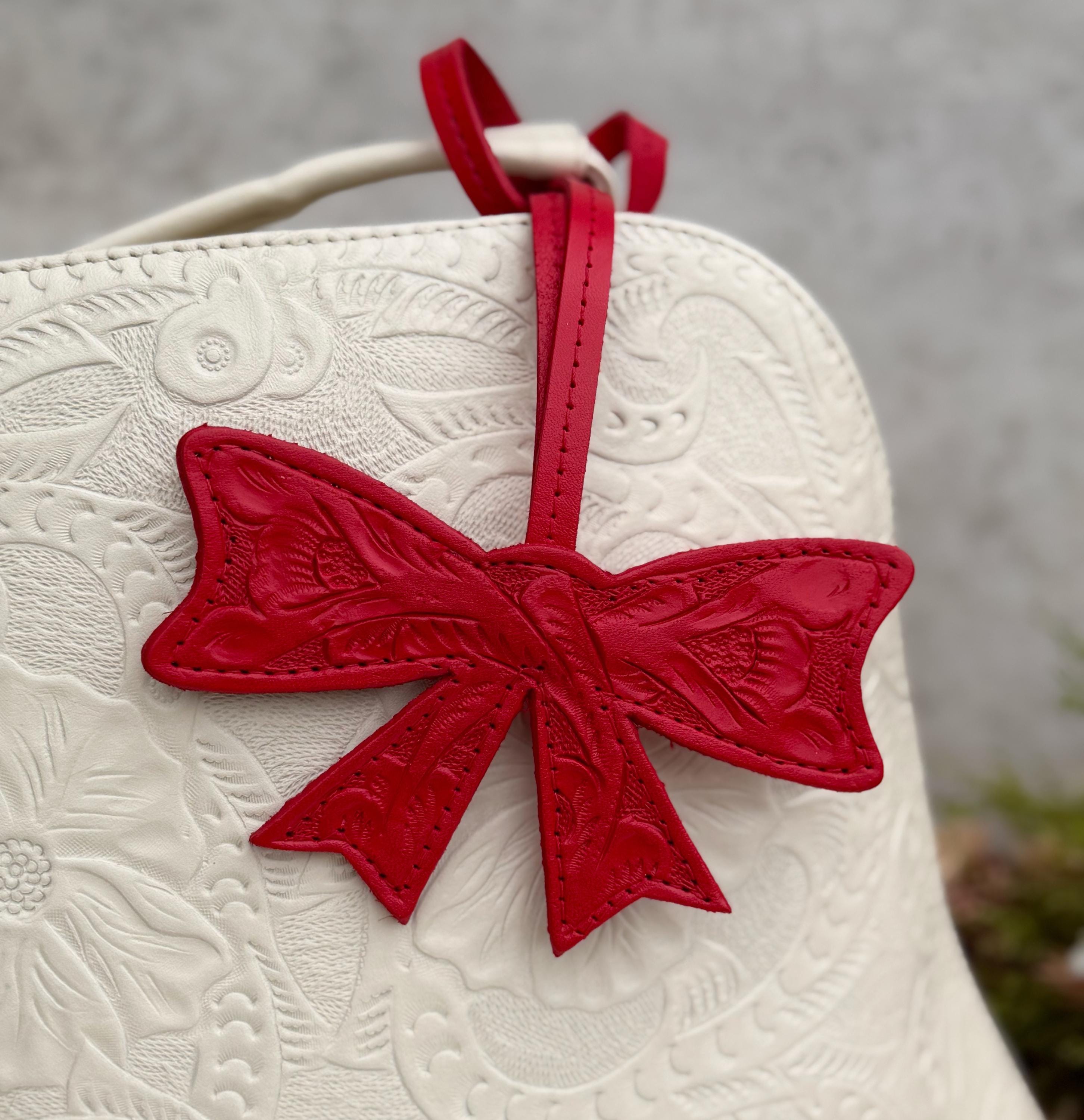Each bow is individually hand-tooled and made from genuine leather, making every piece one of a kind. The removable loop wraps easily around purse straps and suitcase handles, then pulls through to secure. Lightweight, elegant, and easy to move from one bag to another.