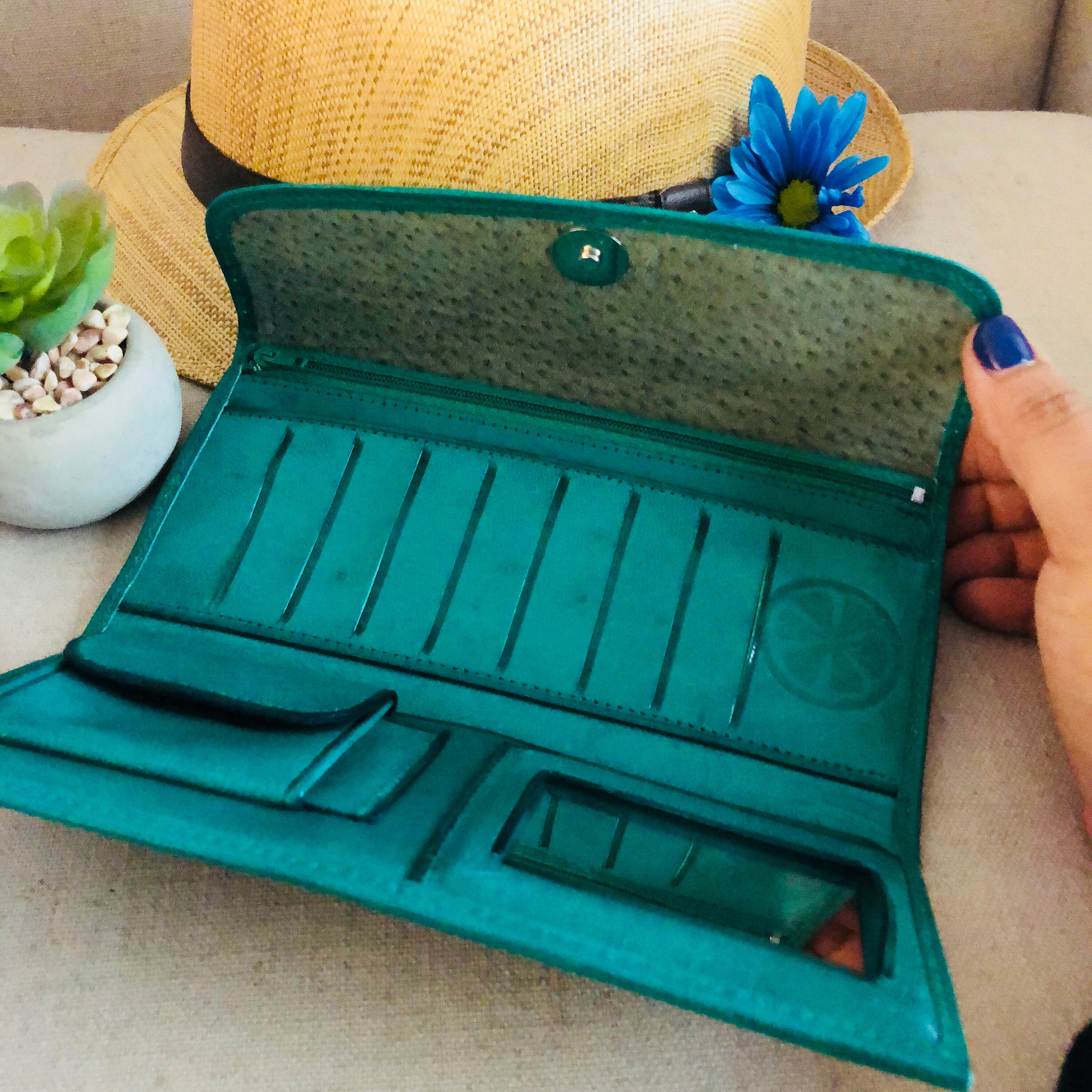 It has 8 Credit Card Slots, One Zipper compartment, one bohemian coin bag, one mirror and two bill compartments.