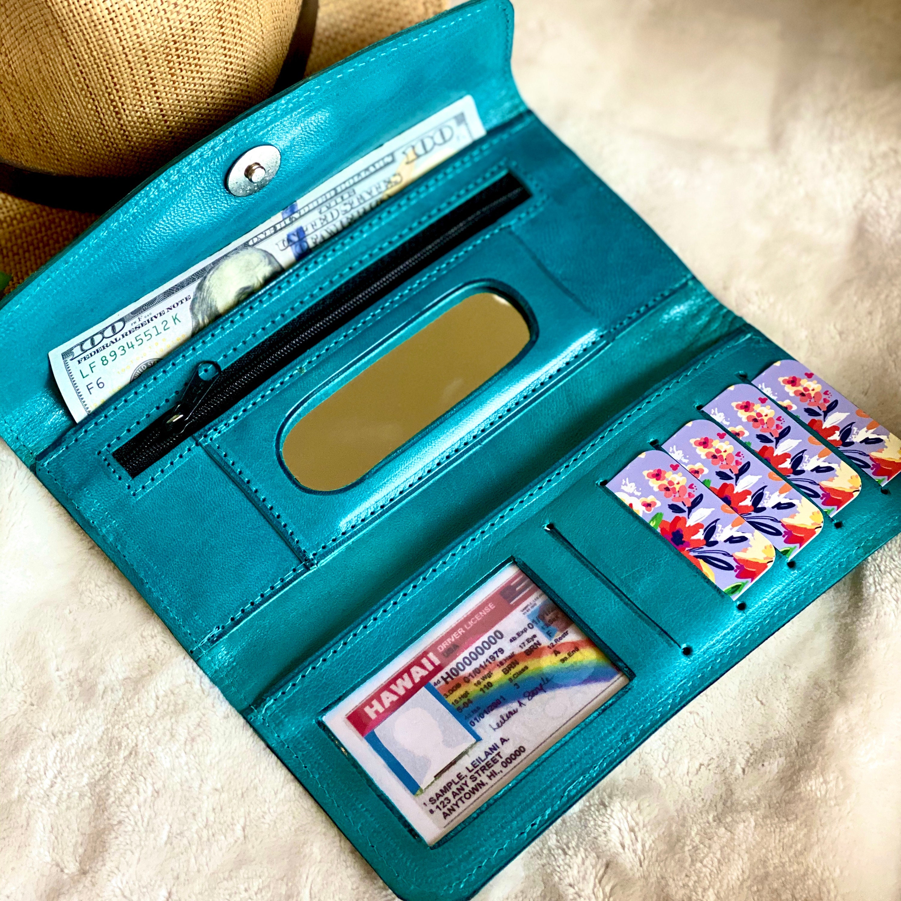 It has 5 Credit Card Slots, One Zipper compartment, one bohemian coin bag, one mirror and two bill compartments.
