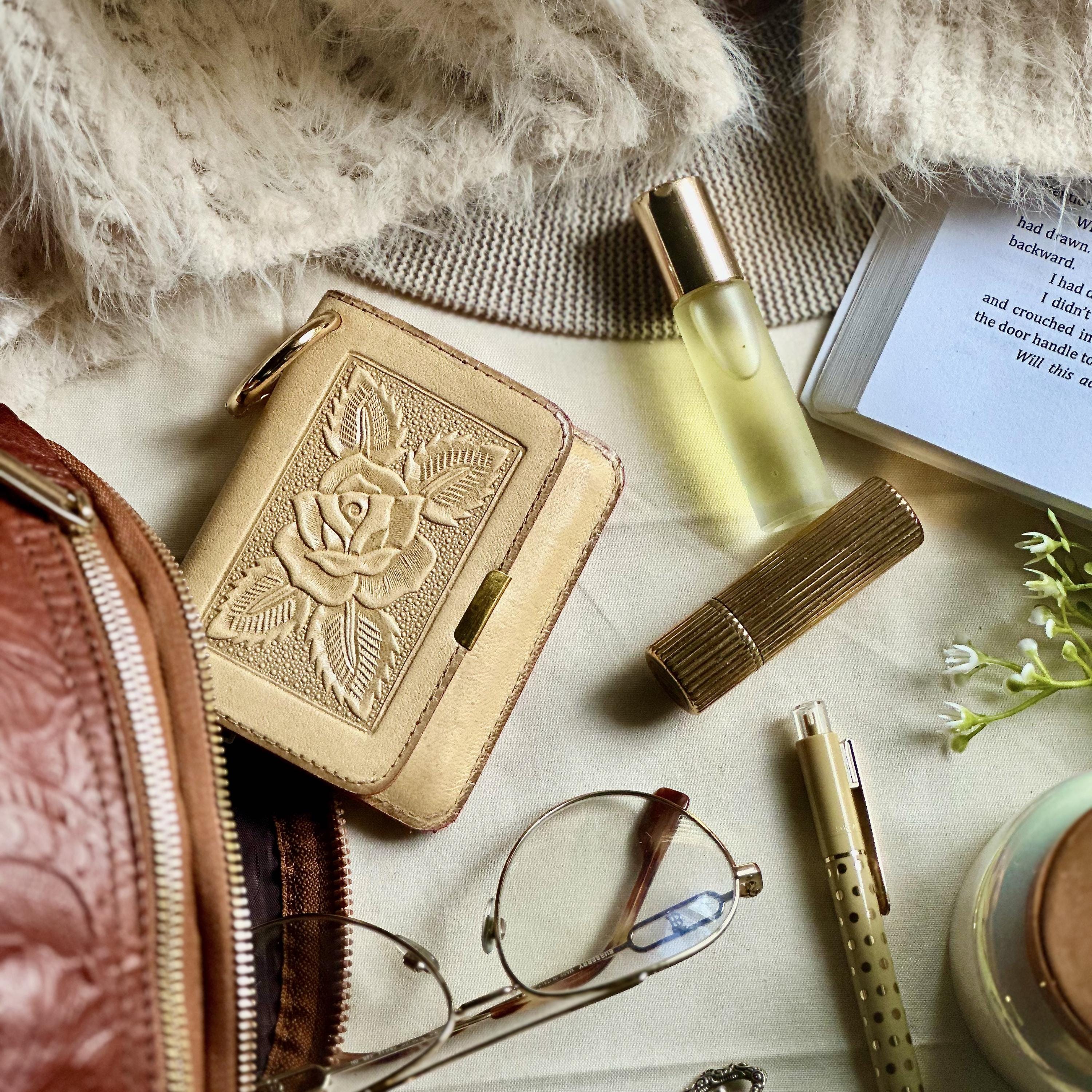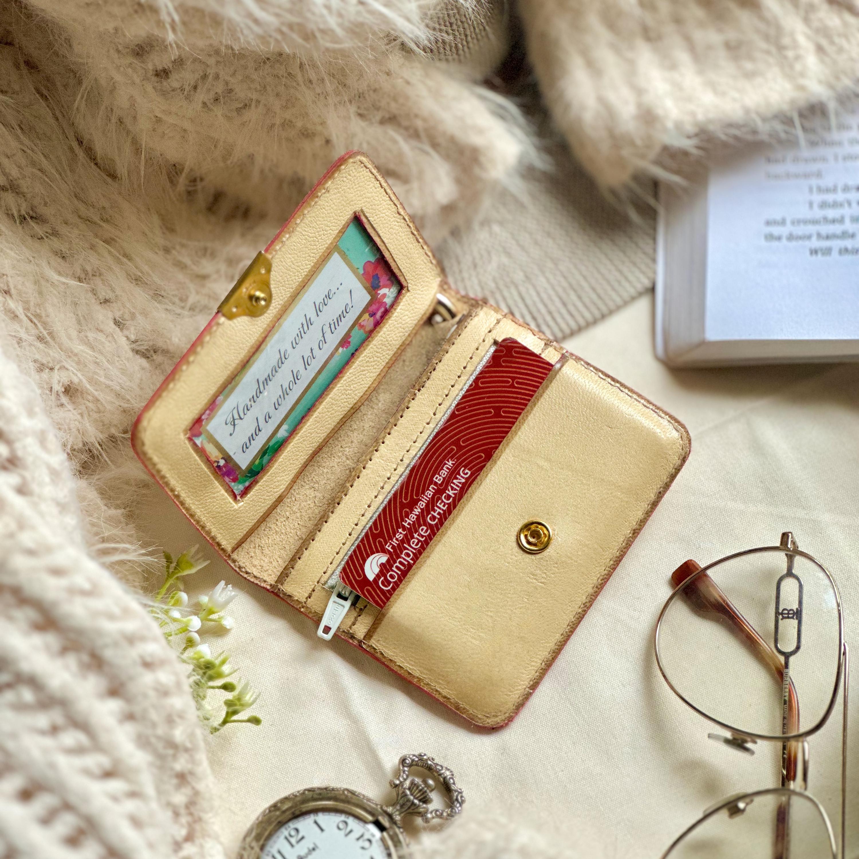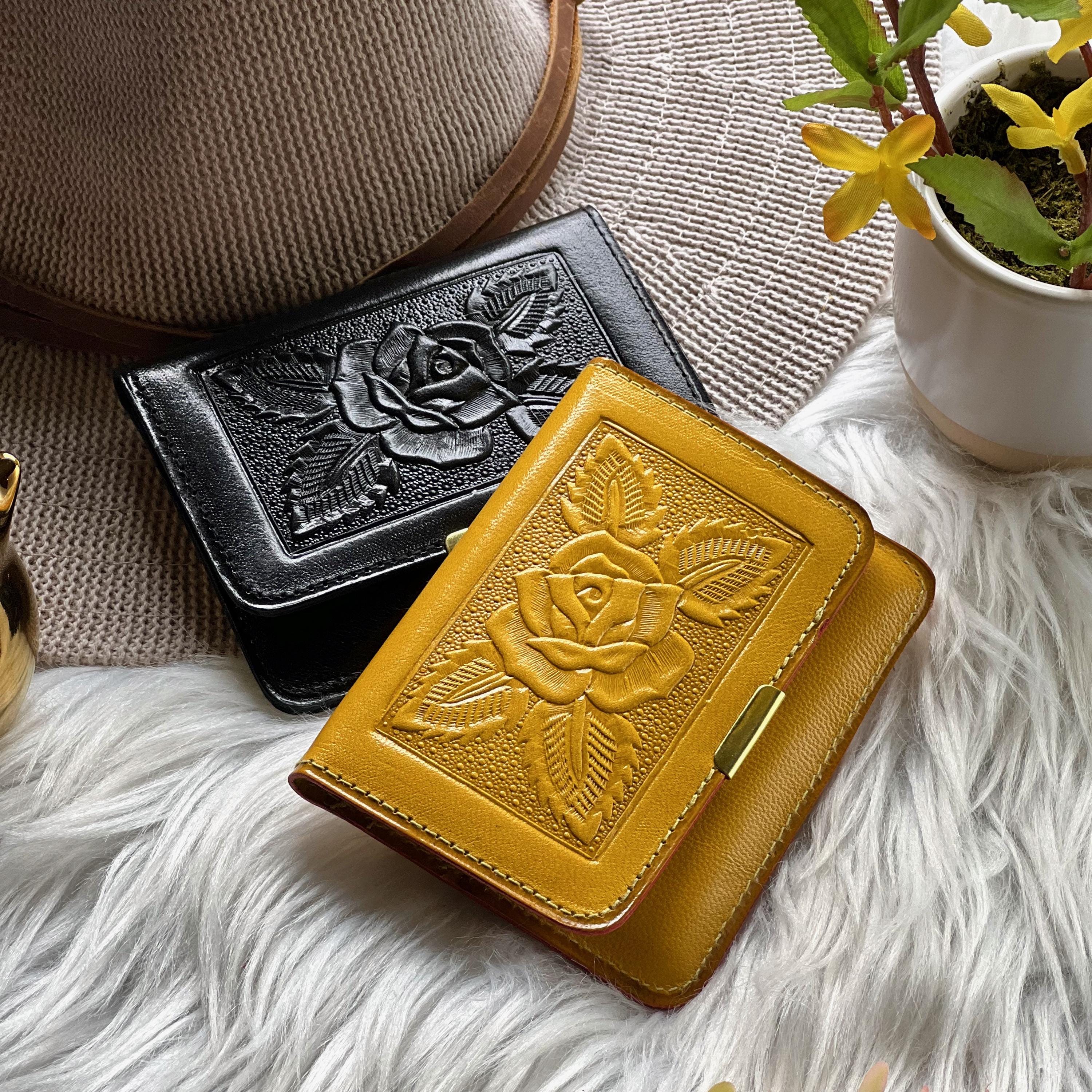 A small embossed leather wallet for women, handcrafted from genuine sustainable leather and finished with delicate floral embossing. Compact, functional, and beautifully made, this wallet keeps your essentials organized without the bulk - perfect for everyday use or as a meaningful gift for her.