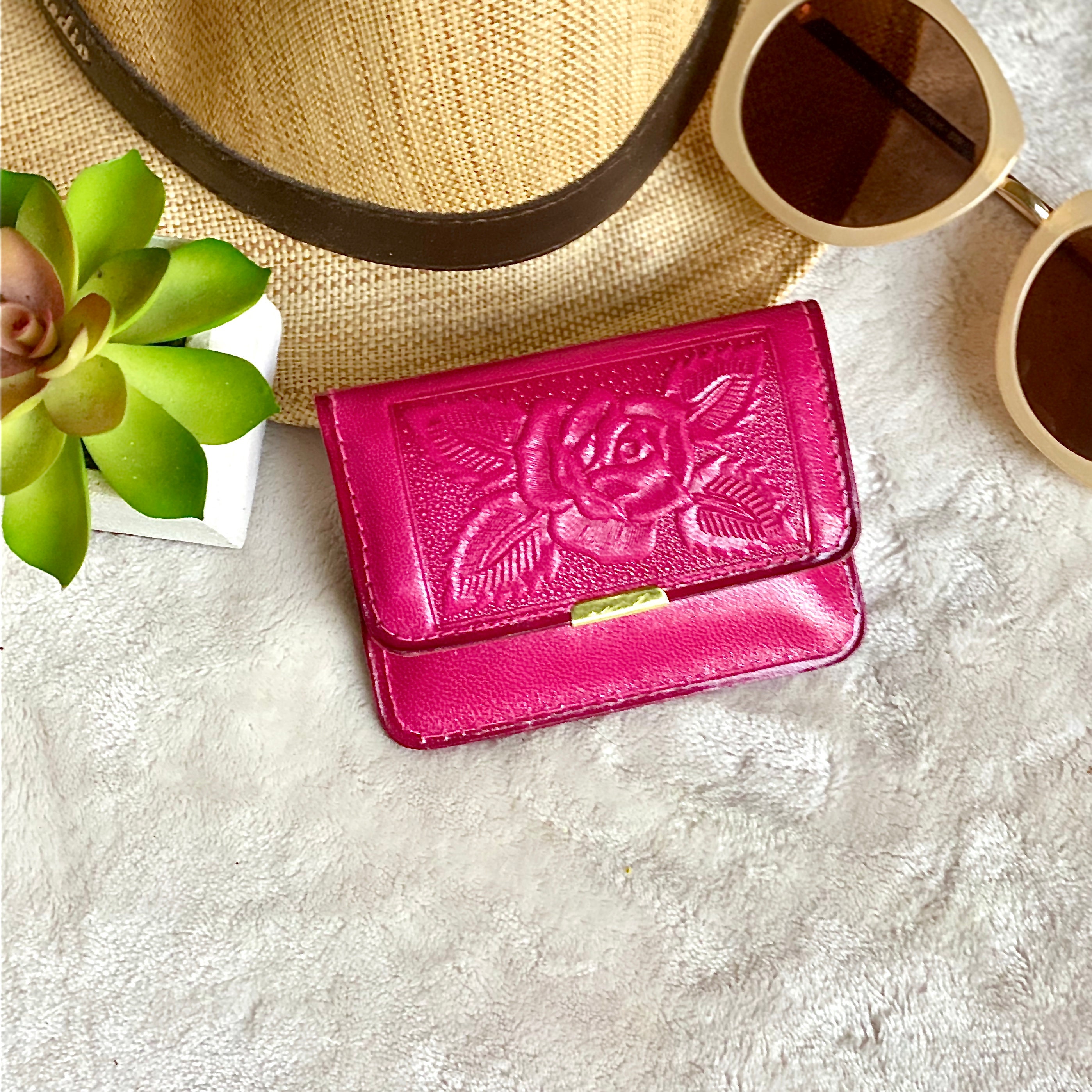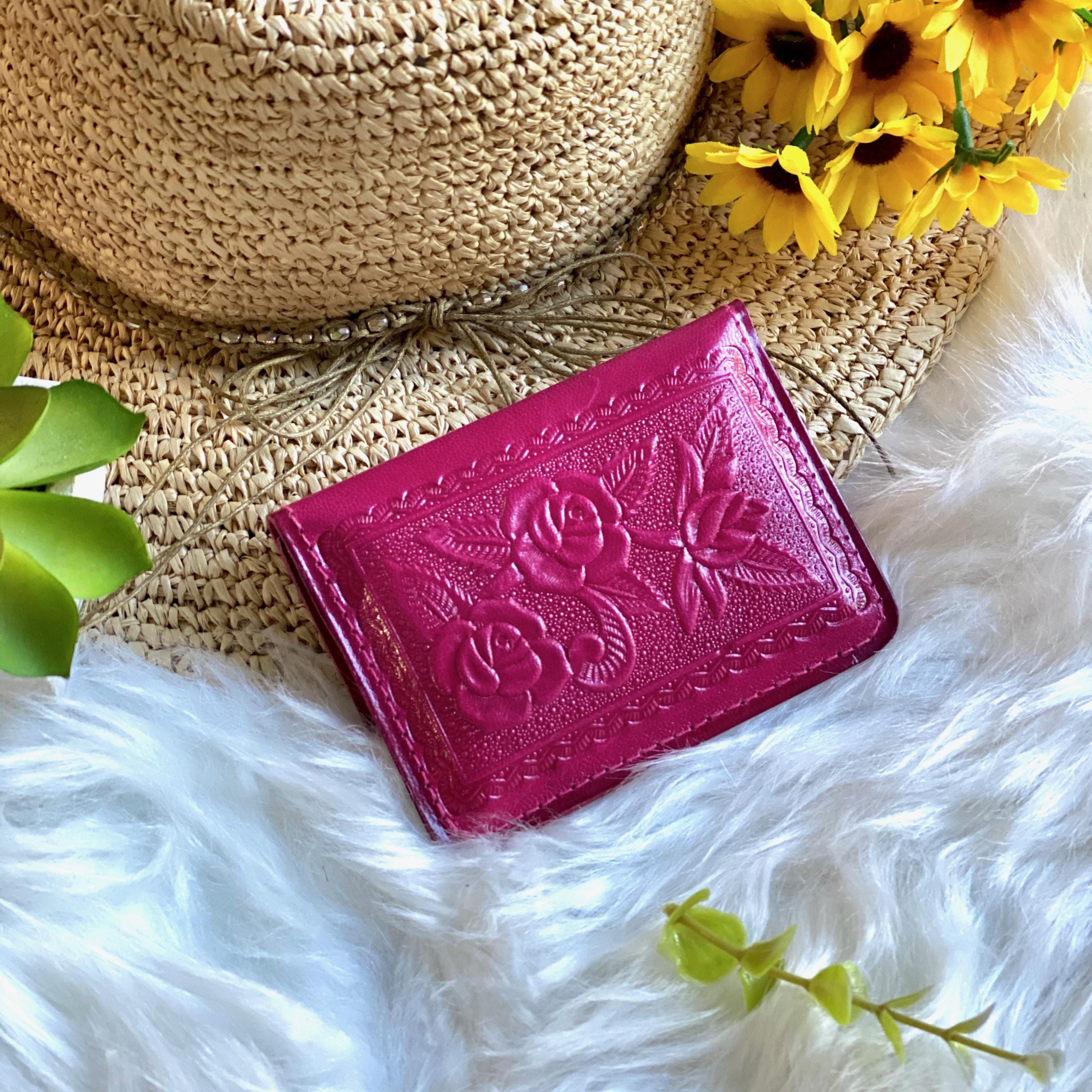 Hand-embossed with a blooming rose design, this small leather wallet is handmade from sustainable leather and designed to fit your essentials beautifully. Available in pink, chartreuse, green, and cognac - a timeless little gift with a handcrafted touch. đż