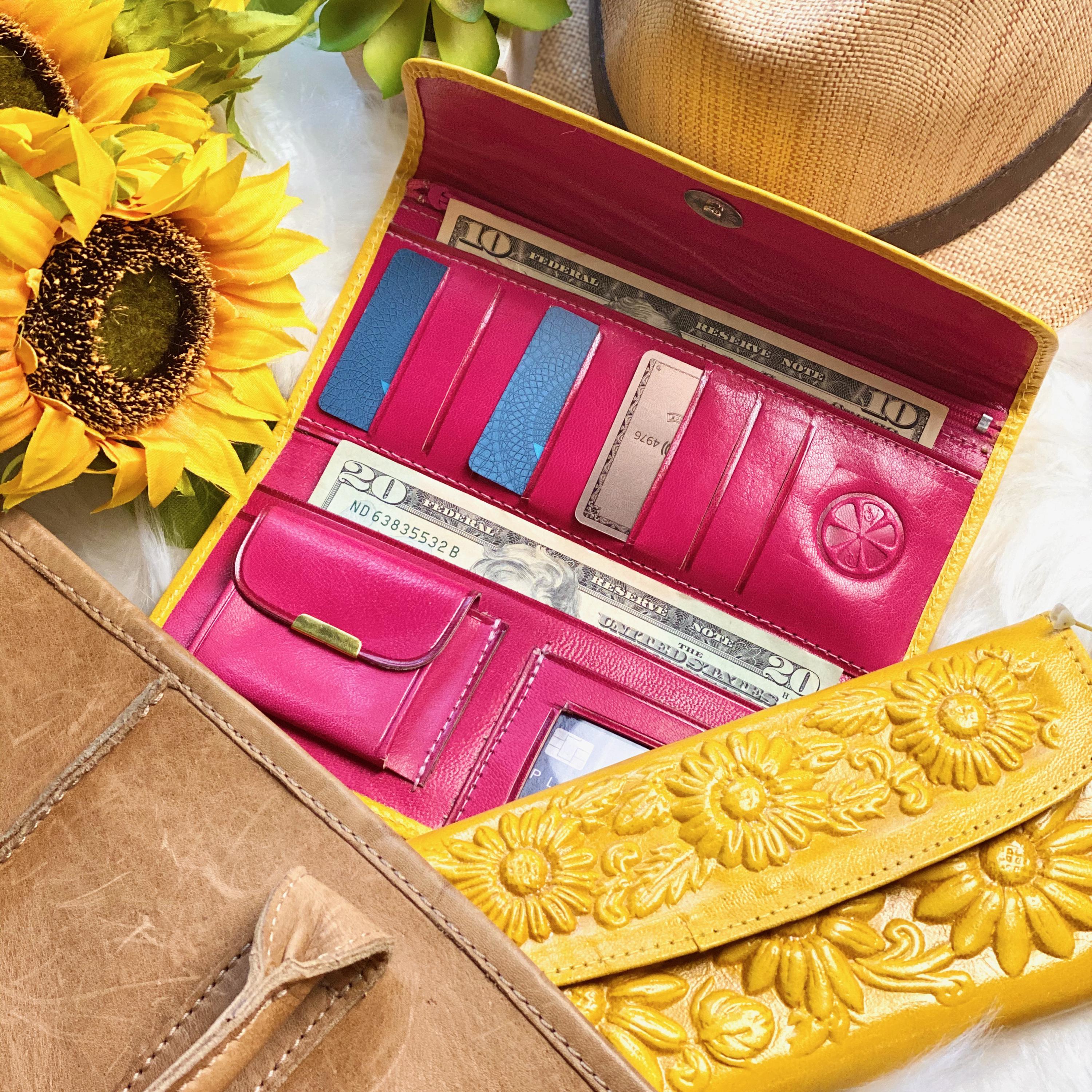 This sunflower leather wallet is handcrafted one at a time using sustainably sourced genuine leather. Each wallet takes approximately 6 hours to create and features detailed hand-tooled sunflower artwork inspired by boho, western, and cottagecore style.