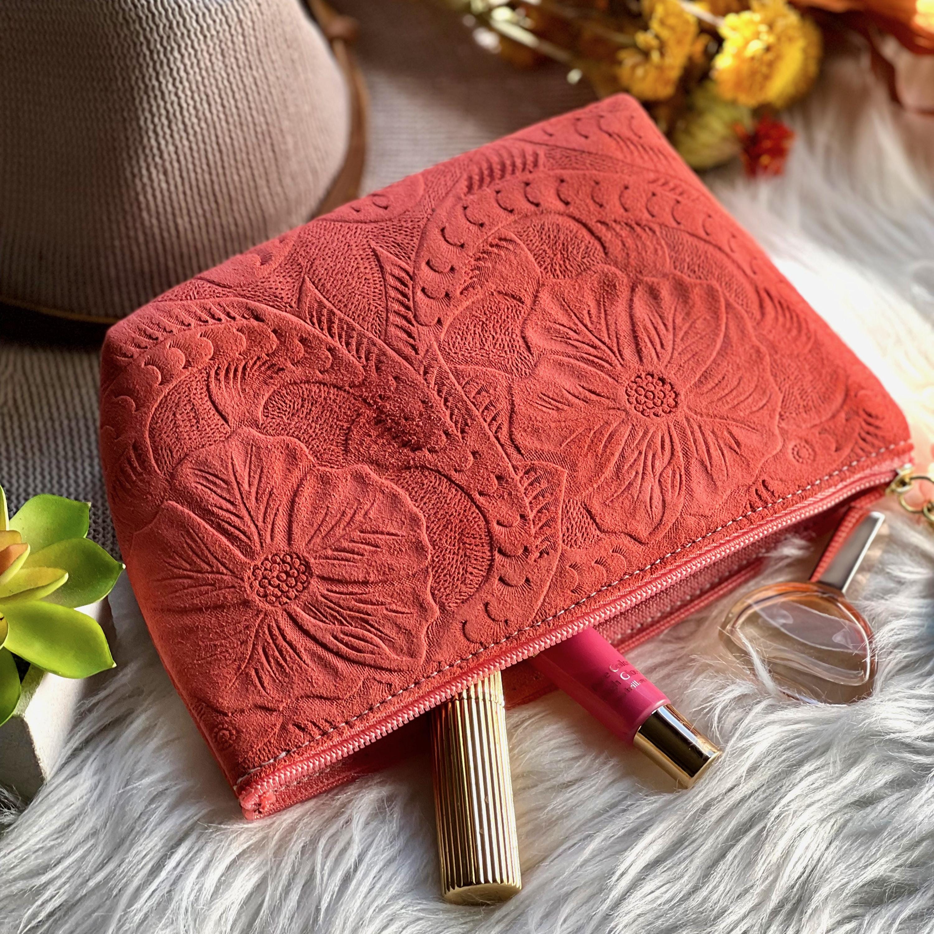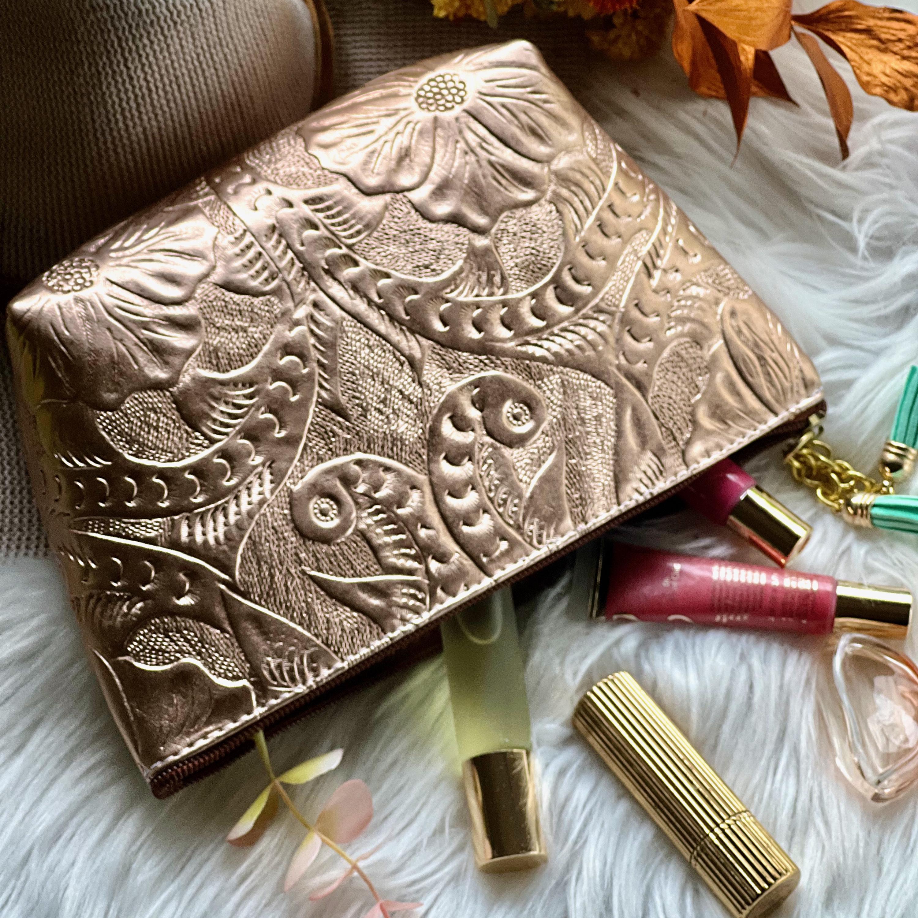 Very beautifully done embossed leather cosmetic bag. It will be a delight to use!