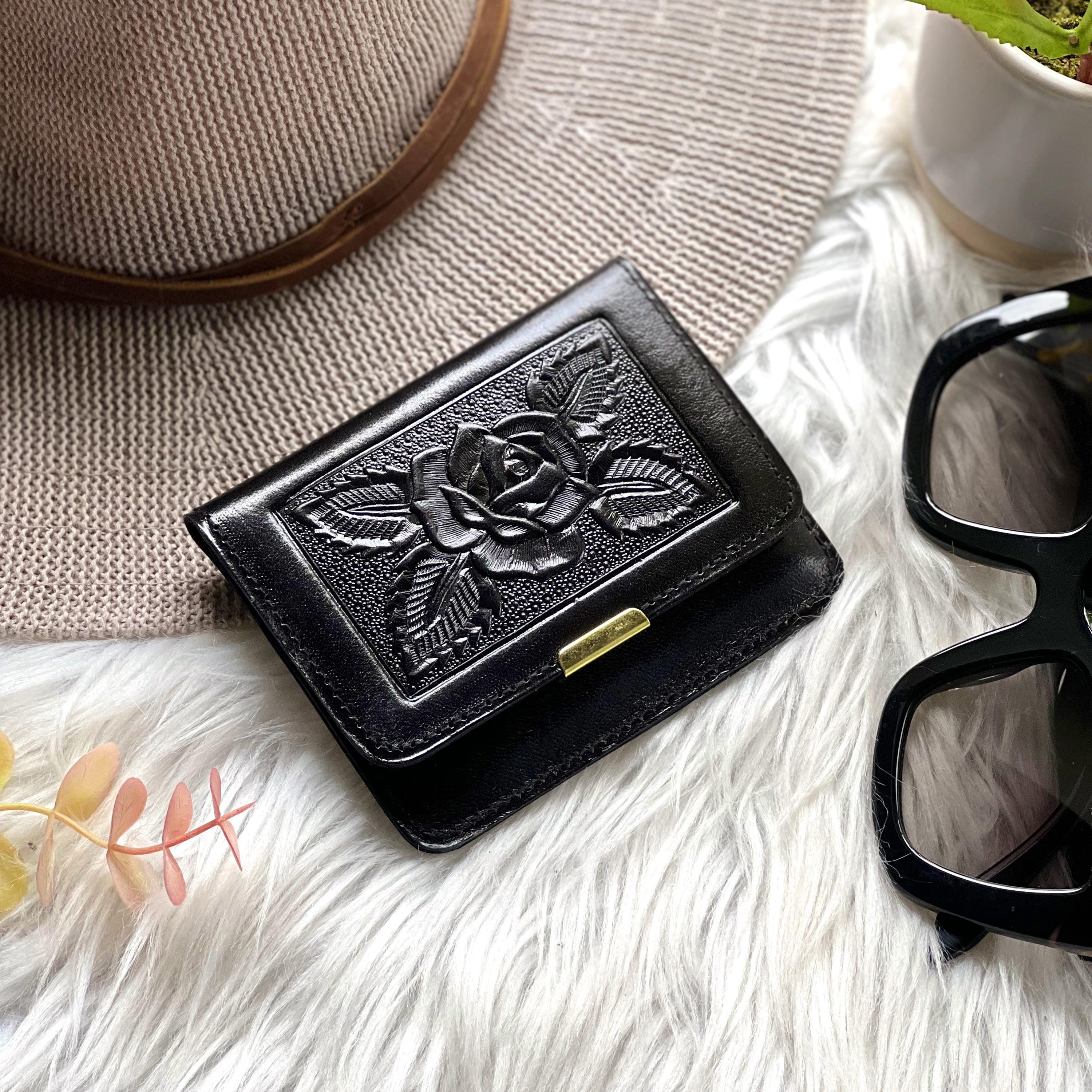 Each wallet features delicate embossed roses, adding a touch of charm to its rustic appeal.