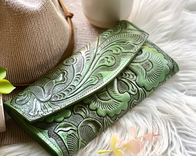 Handcrafted Embossed Leather Wallet for Women: Floral Long Wallet